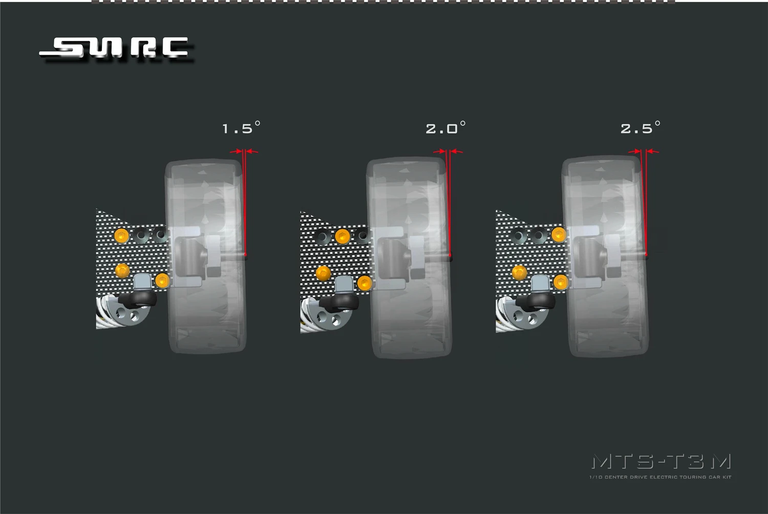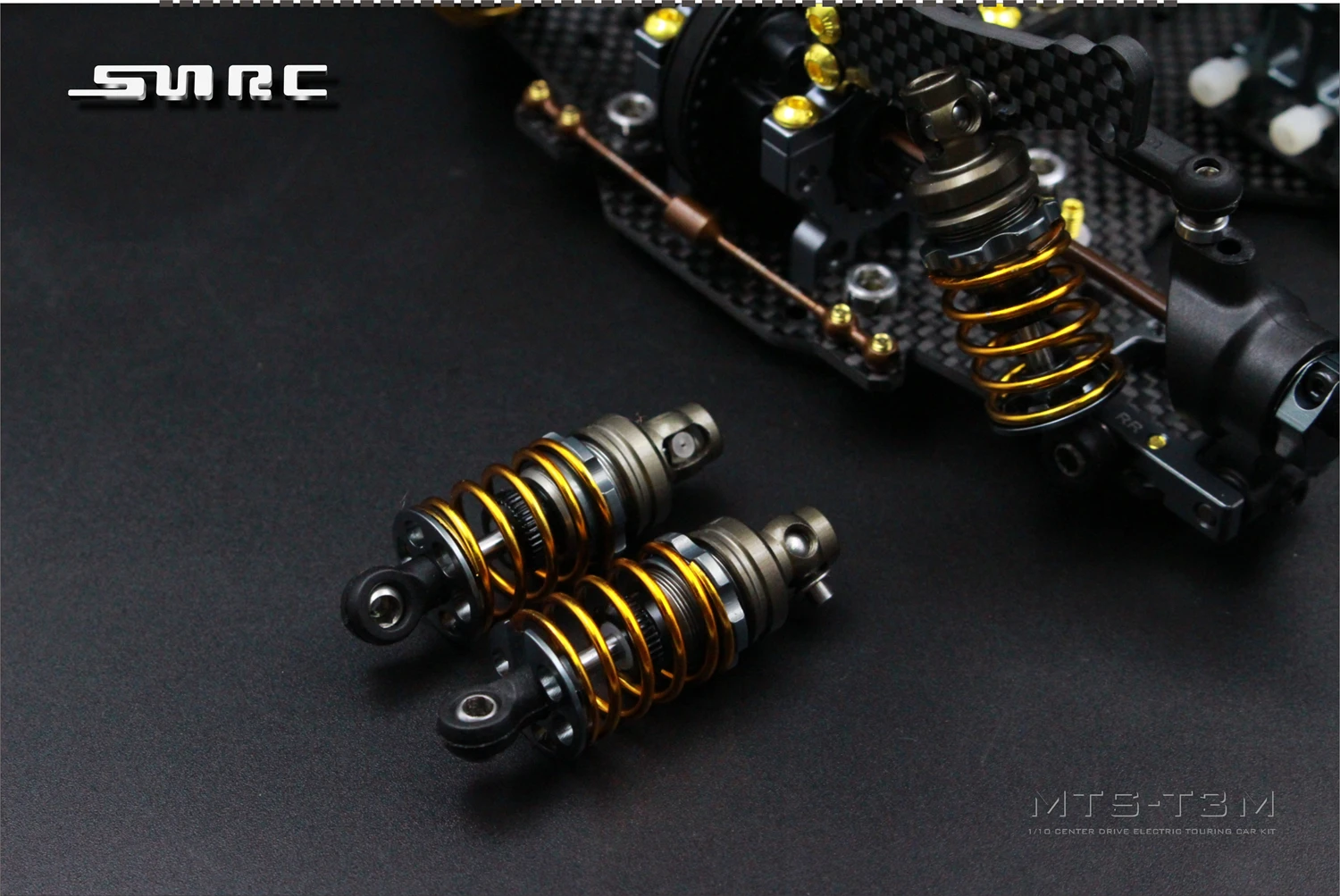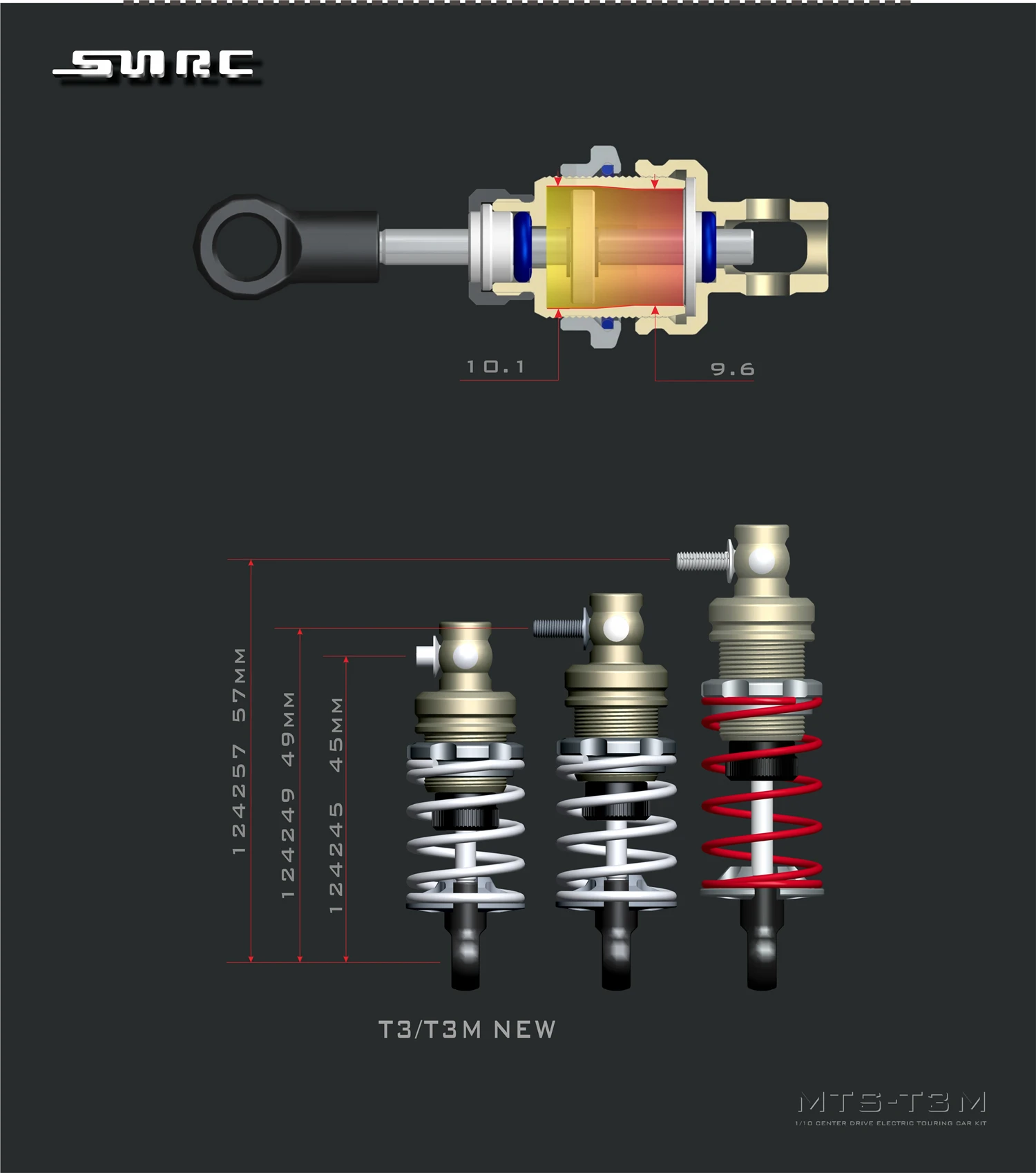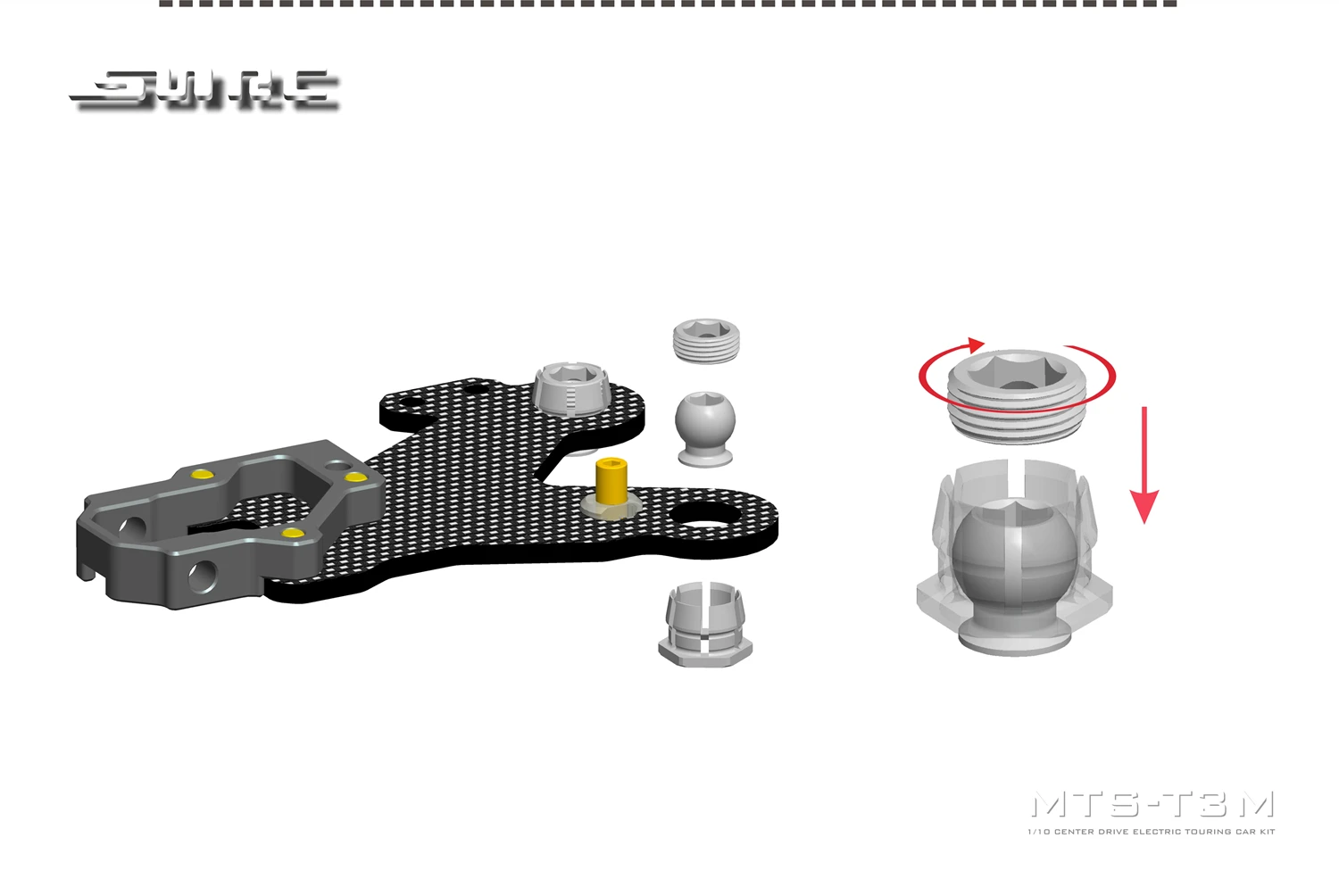 Подвеска изготовлена из графитового материала и работает с ЧПУ сделанным алюминиевым поворотным шаровым комплектом, что позволяет свободно плавать на руке, чтобы улучшить тяговую прокатку и повысить стабильность вождения. Кроме того, внутренняя часть sc-shock имеет форму конуса для повышения стабильности вождения автомобиля на высоком треке. Верхняя крышка с твердым покрытием решает проблему ношения.