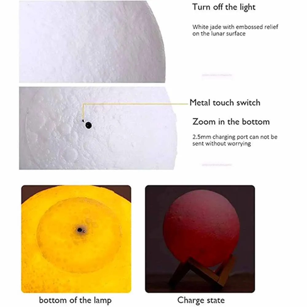 【Безопасный материал + технология 3D 】 бесшовное моделирование лунных светодиодных ламп, разработанное с использованием технологии 3D печати высокого качества. Материал светодиодной лампы изготовлен из ABS + PAC сертифицированного материала PLA. Леса деревянного материала на земле приближают вас к расстоянию между Луной и людьми.