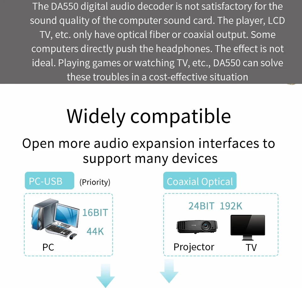 -Чип: CM108 + CS8416 + CS4344 + NE5532 + 12.288MHZ10ppm ЧАСЫ PLL circuit -Поддержка системы: windows xp,windows VISTA,windows 7,MAC OS,Linux (Совместимость 32 бит и 64 бит) -Повторная Настройка, для большинства звуковых карт на вашем компьютере не является идеальным. -Плеер, ЖК-телевизор, только волоконно-оптический или коаксиальный выход, есть некоторые компьютеры непосредственно на гарнитуру не идеально, низкий уровень шума, большие, наушники с высоким сопротивлением более трудно нажимать, или независимо от человека, который любит тихие вечера играть в игры или смотреть телевизор, Идеальный музыкальный артефакт, экономичный DA550 -Входной интерфейс: USB коаксиальный (входной интерфейс полный) приоритет сигнала USB, -Выход: Стандартный Линейный выход RCA s (усилитель может быть подключен к динамикам с питанием и т. д.) -Независимые выходы усилителя: стандартный 3,5 Интерфейс (громкость усилителя регулируется независимо, прост в использовании) (также используется для выхода сигнала, более высокой амплитуды) -Amp использует стандартный двойной op amp, с IC гнездом, вы можете владеть любой лучше и лучше производительности op amp s, играемость очень сильна, вы можете обновить себя Архитектура машинного чипа: -CM108 + CS8416 + CS4344 + NE5532 + 12,288 MHZ10ppm ЧАСЫ PLL circuit -Как универсальный продукт, стабильный, простой в использовании, производительность также хорошая, является наиболее практичным, поэтому USB использует CM108 USB декодер чип используется CM108 чип, более стабильная поддержка USB2.0 высокой скорости передачи, цифровой выход непосредственно к DAC частичное декодирование, ваш компьютер windows xp, windows VISTA, windows 7, MAC OS, linux и т. д. 32 или 64 системы не требуются для установки каких-либо драйверов Внимание: 1: предоставьте три независимых интерфейса ввода: приоритет USB, вставьте Автоматическое переключение USB A: оптоволоконный вход. (Поддерживает вход до 192 кГц/24 бит) Примечание: При использовании волоконной оптики для декодирования машины я не могу использовать usb-порт для питания. B: коаксиальный вход, RCA интерфейс SPDIF цифровой источник входов (поддерживает до 192 кГц/24 бит вход) D: режим USB 16 бит 44K 2: Выходной интерфейс: A: выход RCA, без регулировочный потенциометр B: выход наушников телефона, отдельная регулировка потенциометра