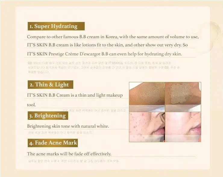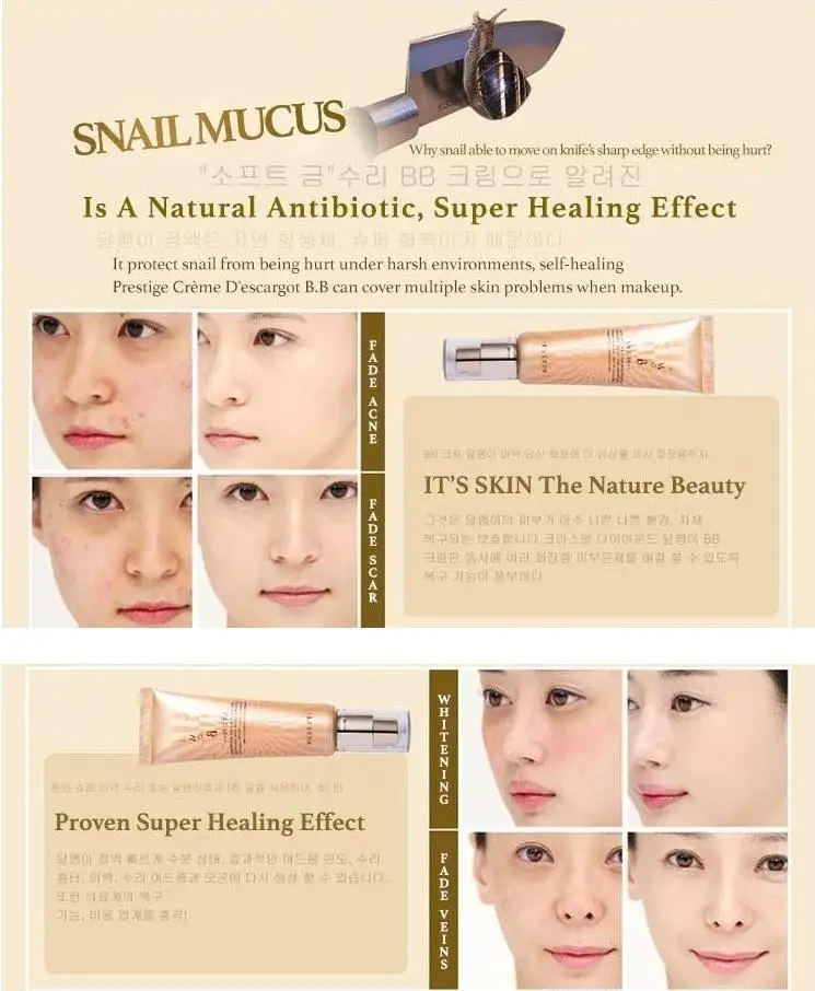 Будь то тусклый вид кожи, склонная к акне кожа, жирная/сухая кожа, престиж Creme D'escargot B.B. работает эффективно, обращая вспять повреждения кожи.