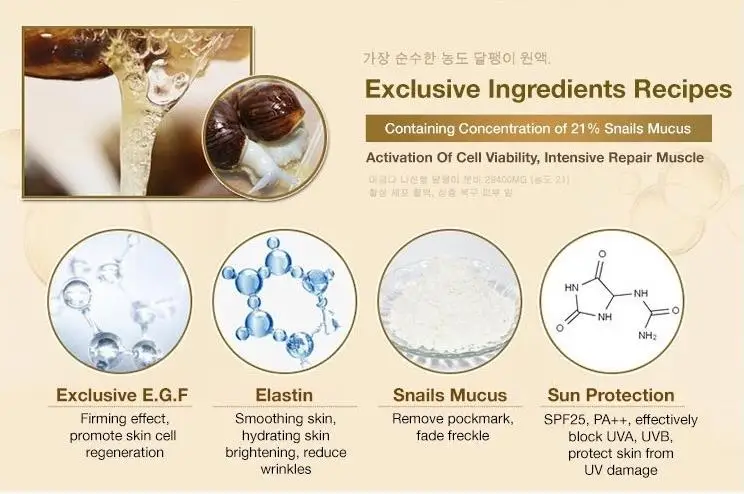 -Содержит экстракт слизи улитки 21%, богатый питательными веществами, эффективно скрывает возраст кожи, восстанавливает BB крем.