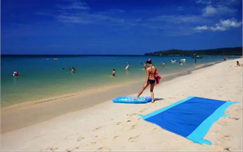 Это универсальный пляжный коврик + занавес для неба. Материал-светильник, износостойкая ткань для зонтиков. Чтобы предотвратить попадание влаги, добавляется Водонепроницаемая функция. Шесть мешков установлены с обеих сторон и заполнены песком, чтобы предотвратить выдувание коврика морским ветром.