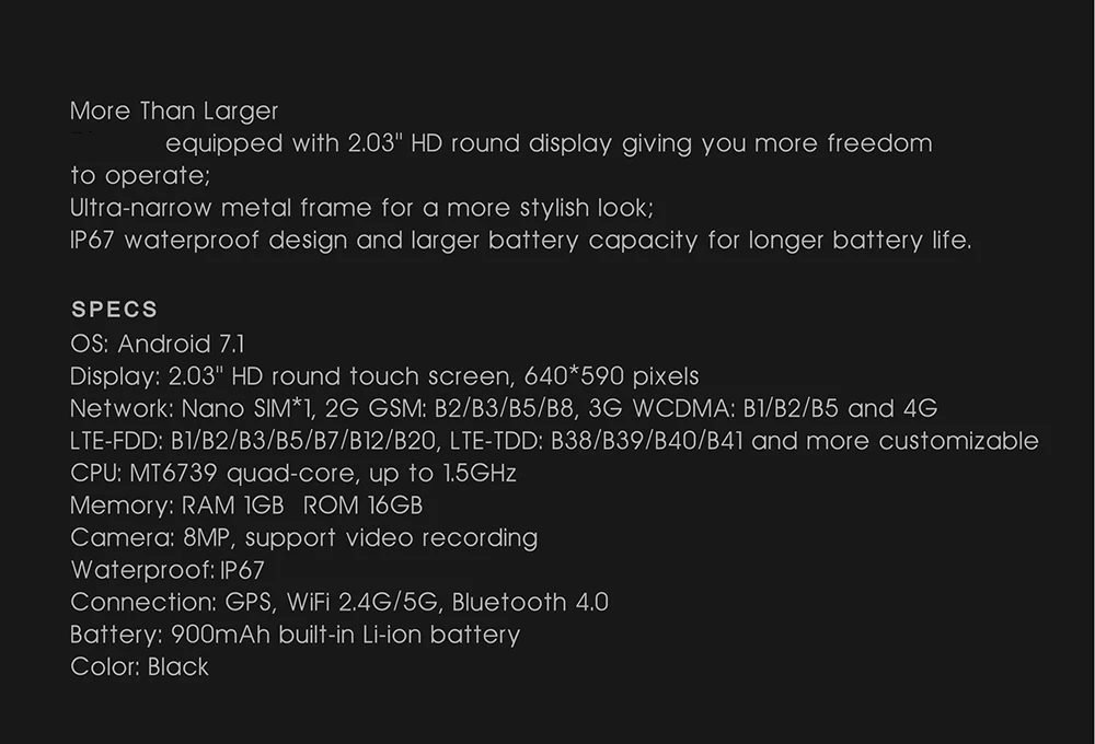 Лучший подарок мужу или парню! Приятных покупок здесь! Особенности 1. ОС: Android 7,1, CPU: MT6739 2. Частотный диапазон: 4G LTE-FDD B1/2/3/5/7/12/20, WCDMA B1/2/5 (Поддержка 4g lte) 3. Поддержка Bluetooth 4,0/GPS-навигации/Wi-Fi 4 монитора сердечного ритма, шагомер, мультиспортивный режим 5. Аккумулятор большой емкости 900 мАч 6 Встроенная камера 8 МП 7 движущихся дисплеев светильник щения 8 экран 2,03 дюйма 640*590 9 сменный ремешок 10 стильных популярных интерфейсов часов на выбор 11 Поддержка версии iOS 11,1 и выше и версии Android 6,0 и выше