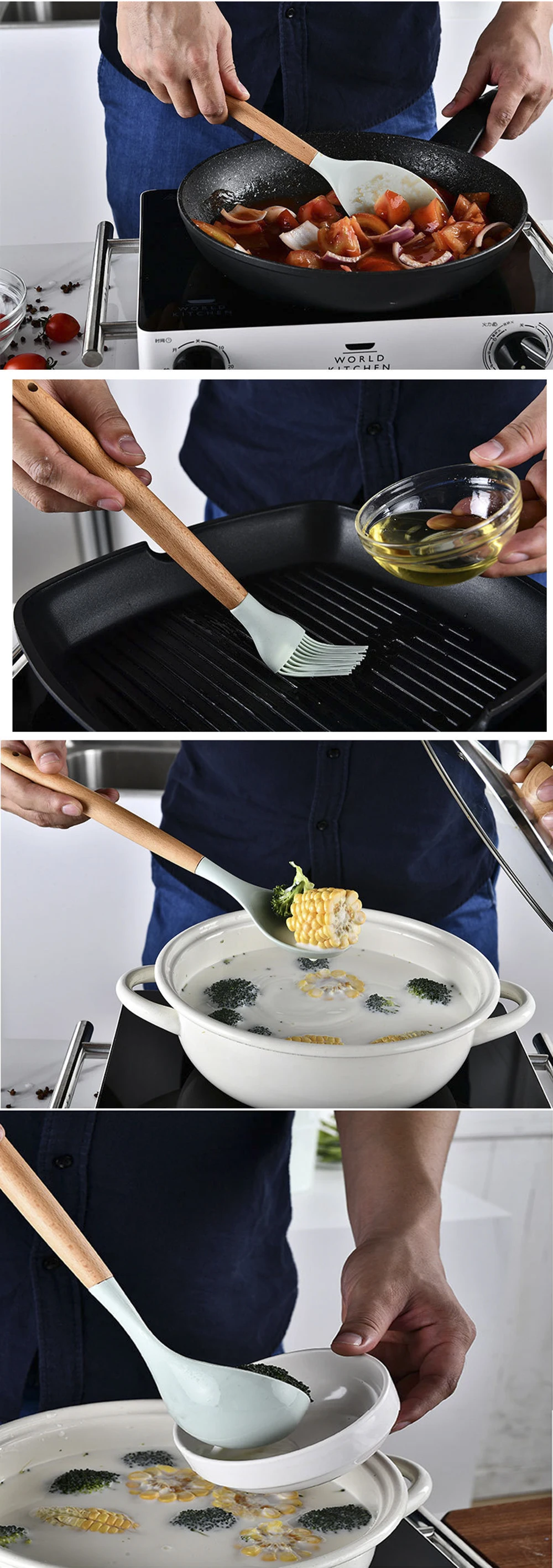 Посылка включает в себя: 12 шт. силиконовых кухонных принадлежностей с деревянной ручкой