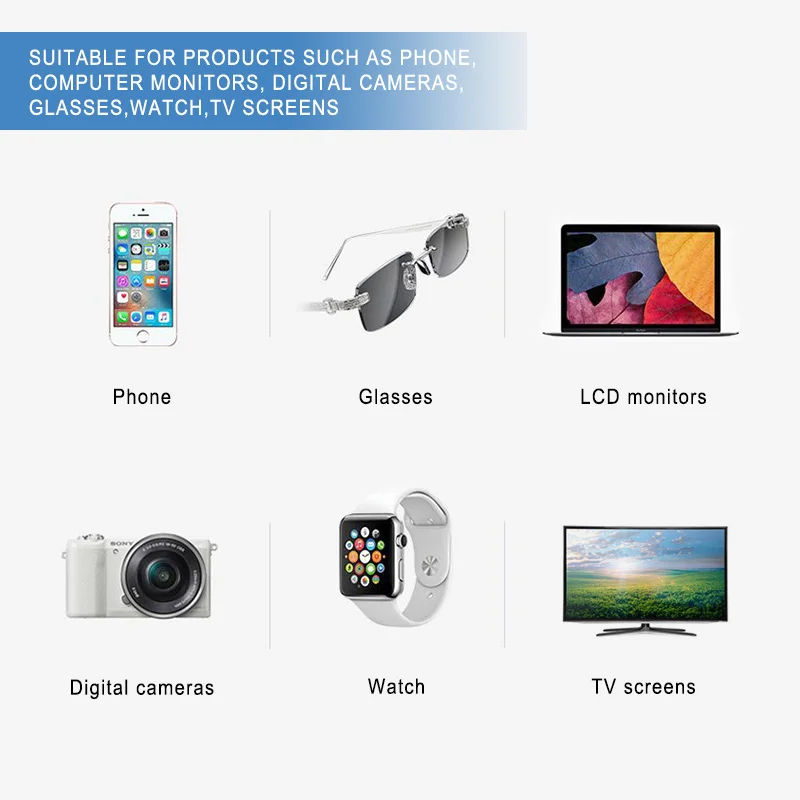 Основное использование: подходит для таких продуктов, как ЖК-мониторы, экраны ТВ, цифровые камеры, компьютерные мониторы, клавиатуры, мониторы, очки.
