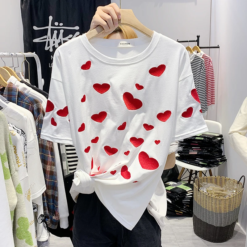 Футболка с вышивкой в виде сердца, хлопковые белые женские топы, летние черные футболки с коротким рукавом, большие размеры, Ретро стиль, Harajuku, корейский стиль 2020, W831
