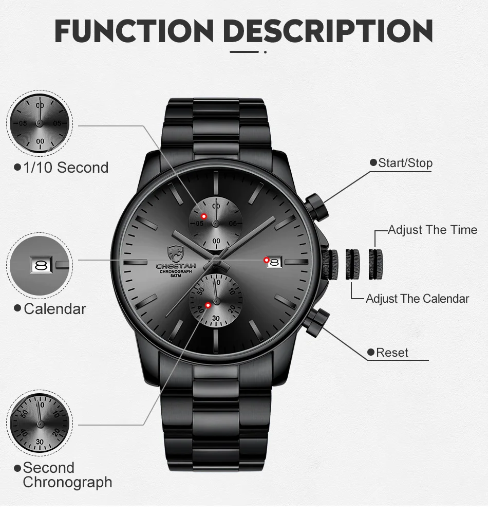 -Все маленькие циферблаты работают -Настоящий хронограф, функции даты -Ремешок для часов из нержавеющей сталиОписание