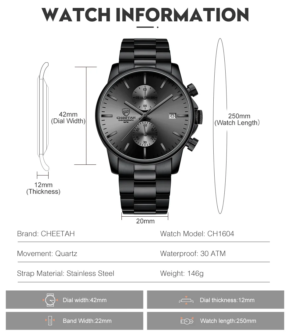 100% новый с биркой и высоким качеством Модные спортивные мужские часы для отдыха Водонепроницаемость (ручная Стирка) Аналоговый дисплей даты Функция реального хронографа Браслет из нержавеющей стали высокого качества Технические характеристики Материал корпуса: сплав Чехол Диаметр: 42 мм Чехол Толщина: 12 мм Материал ремешка:Нержавеющая стальРемешок Длина ремешка: 250 мм (чехол в комплекте) Ширина ремешка: 22 мм Вес: 146 г Что входит в комплект 100% Гепард абсолютно новые мужские часы 1 x аналоговые модные спортивные мужские часы 1 х Оригинальная фирменная коробка гепарда