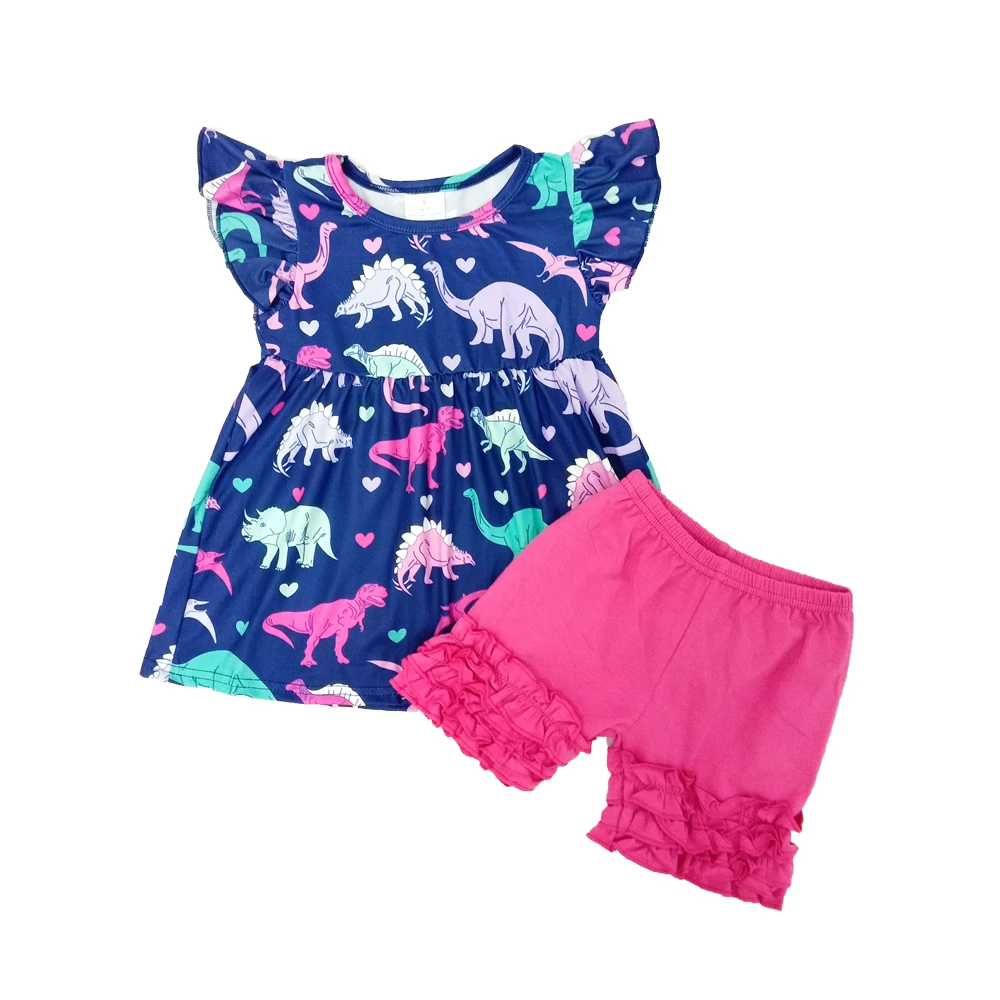 Лидер продаж, Детская летняя одежда с героями мультфильмов топ с динозавром для девочек и шорты с оборками комплект из 2 предметов, повседневная одежда для маленьких девочек