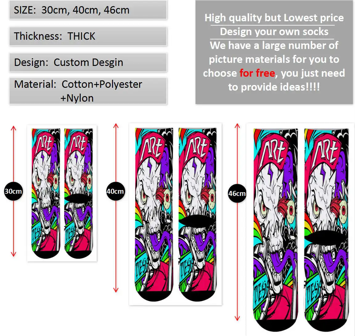 Особенности: модные, яркие, удобные носки. Материал: хлопок Цвет: различные цвета Размер: один размер подходит для большинства людей (США 5-8)(ЕС 35-42) Подходит Пол: мужчин, женщин и мужчин Процесс: двусторонняя печать Длина: 40 см Размер: один размер подходит для большинства людей (США 7-13)(ЕС 40-48) Эластичная растяжка: 40 ~ 60 см Вес: 45 г Упаковка: 1 пара носков, opp
