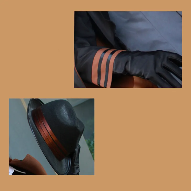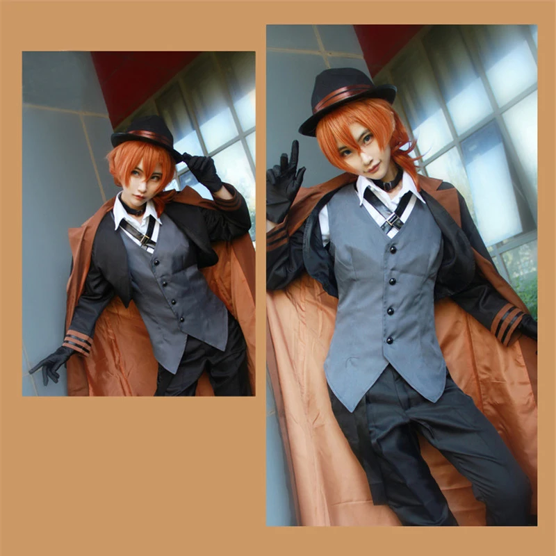 9 шт., мужской костюм Чуя-накахара для косплея В комплект одежды входят: рубашка, маленькая куртка с рукавами, Длинная ветровка, жилет, брюки, шейный платок, перекрещивающиеся длинные лямки, перчатки, шапки
