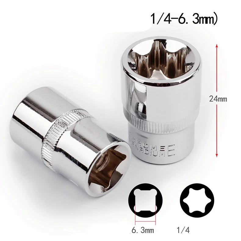 ① Высокий крутящий момент, 6-точечные розетки захватывают плоские стороны крепежа, а не углы, предотвращая Закругление
