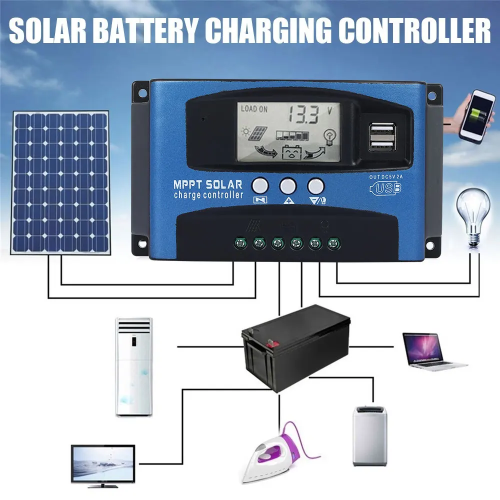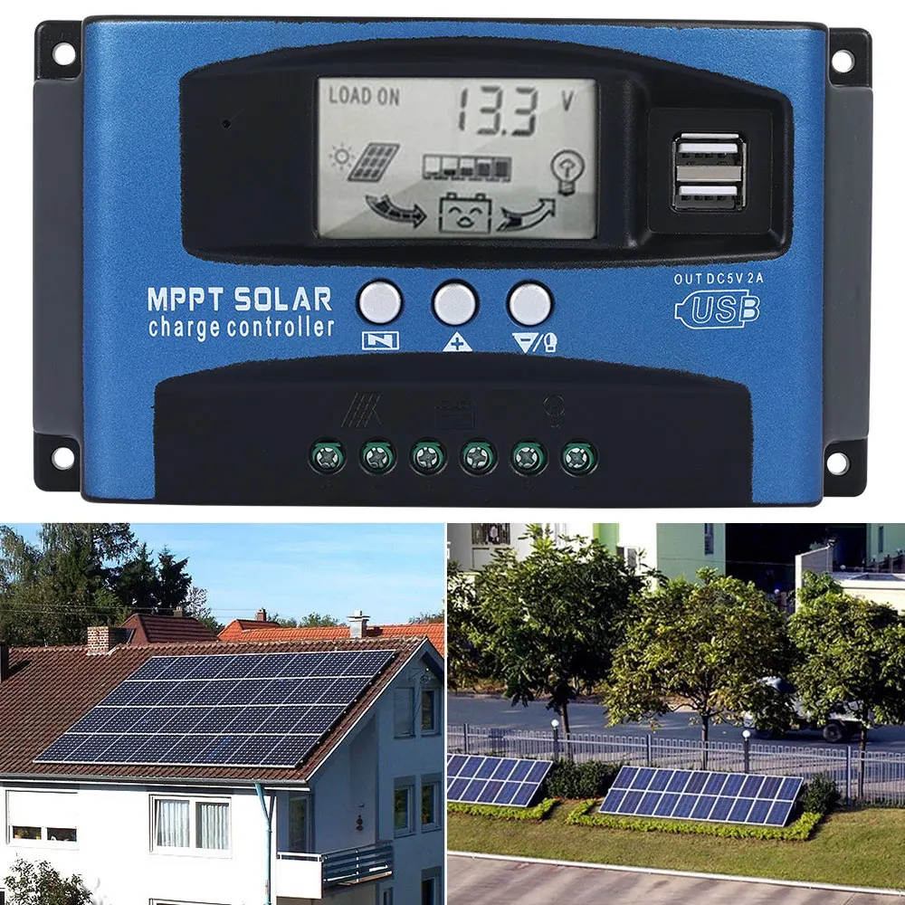 Название продукта: Солнечный контроллер Материал: алюминиевый сплав и АБС Цвет: синий Номинальный ток зарядки: 30A, 40A, 60A, 100A (переменный параметр) Номинальный ток зарядки: 10A, 10A, 20A, 30A (переменный параметр) Фотоэлектрическая система на солнечной напряжение: 12V 18V панели солнечных батарей, 24V с 26V панели солнечных батарей Полный значения напряжения: литиевая батарея (12,2 V), B02 коллоидная тип (14,2 V), B03 открытого типа (14,6 V) Напряжение зарядки: 13,7 в (по умолчанию, регулируется) Напряжение отключения разряда: 10,7 В (по умолчанию, регулируется) Восстановление сброса напряжение: 12,6 V (значение по умолчанию, регулируемый) Ток в режиме ожидания: <10 мА Выход USB: 5 В/2 А Рабочая температура: -35 °C + 60 °C