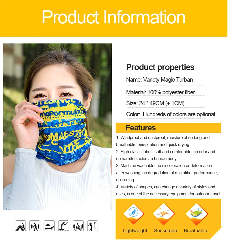 Название продукта: разнообразный бесшовный тюрбан для верховой езды, разнообразный волшебный тюрбан (многофункциональный) Технические характеристики: Длина 49 см ± 1 см, ширина 24 см ± 1 см Способ печати: термоперенос Упаковка: один посылка Материал: 100% полиэстер, микрофибра Характеристики продукта: бесшовная текстильная обработка без швов, отличная эластичность, отсутствие деформаций, не выцветание, машинная стирка Функции продукта: ветрозащитный, впитывающий пот, теплый, дышащий Использование продукта: что угодно, его можно использовать как шляпу, повязку на голову, повязку для волос, нагрудник, запястье и т. д. Размер-один размер, подходит для модных молодых мужчин и женщин.