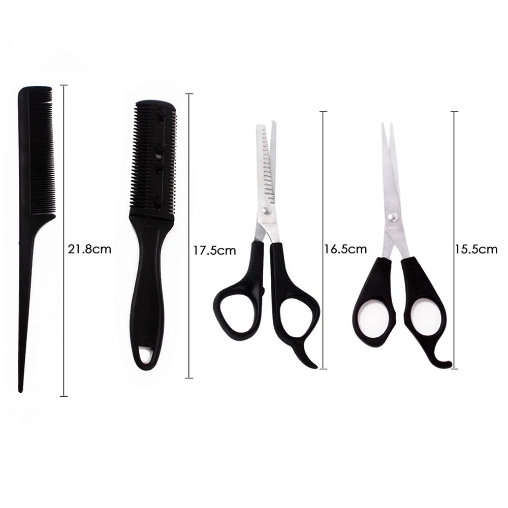Тип товара: парикмахерский набор Материал: пластик + нержавеющая сталь Цвет: черный Размер изделия: как на картинке Количество: 4 шт. Упаковка включает: 1 x ножницы для стрижки волос, 1 x Ножницы для истончения волос, 1 x гребень для волос, 1 x гребень для стрижки волос