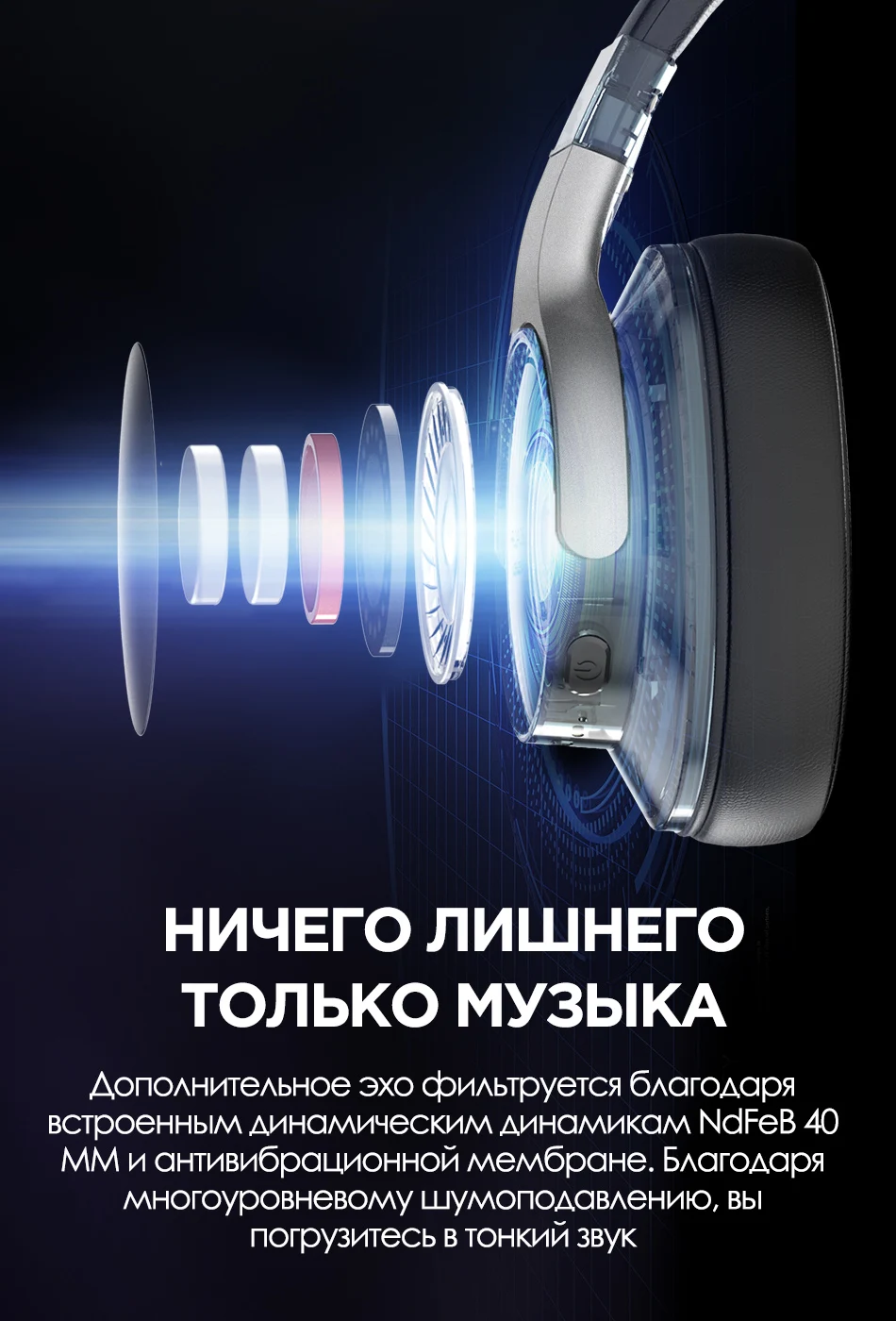 Дополнительное эхо фильтруется благодаря встроенным динамическим динамикам NdFeB 40 ММ и антивибрационной мембране. Благодаря многоуровневому шумоподавлению, вы погрузитесь в тонкий звук