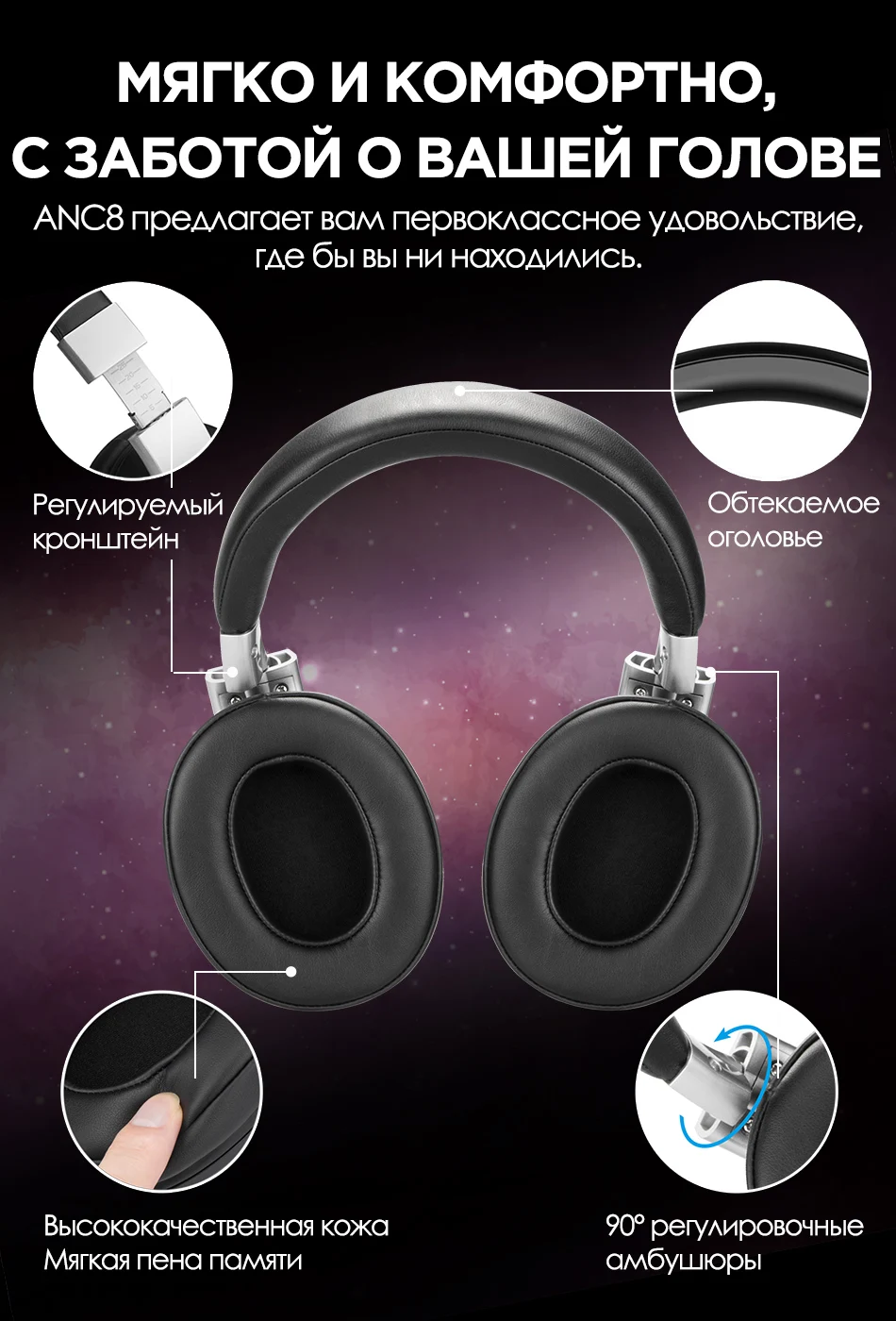 ANC8 предлагает вам первоклассное удовольствие, где бы вы ни находились. Более удобное прилегание и меньше утечки звука благодаря использованию высококачественной кожи с высоким содержанием белка и мягкой пены с эффектом памяти. Обтекаемое оголовье с модным матовым дизайном естественно облегает вашу голову. Наушники настроены для вашей головы благодаря эргономичному дизайну, оснащены регулировочным рычагом на 90°