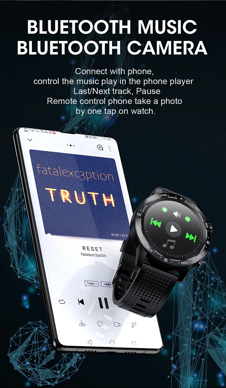 Подключается к телефону, управление музыкой в проигрывателе телефона Последний/следующий трек. Пауза Телефон с дистанционным управлением, фотосъемка одним касанием на часах