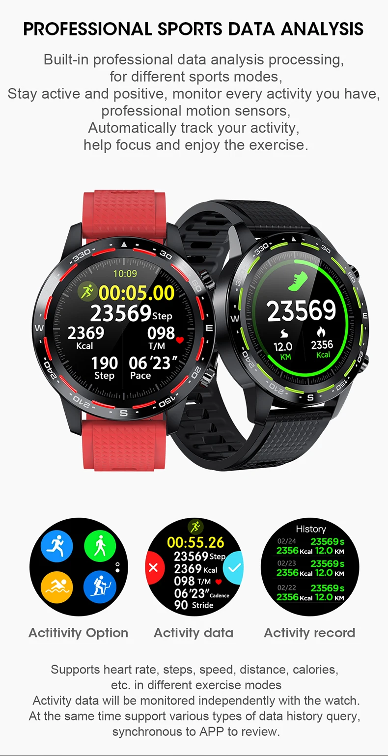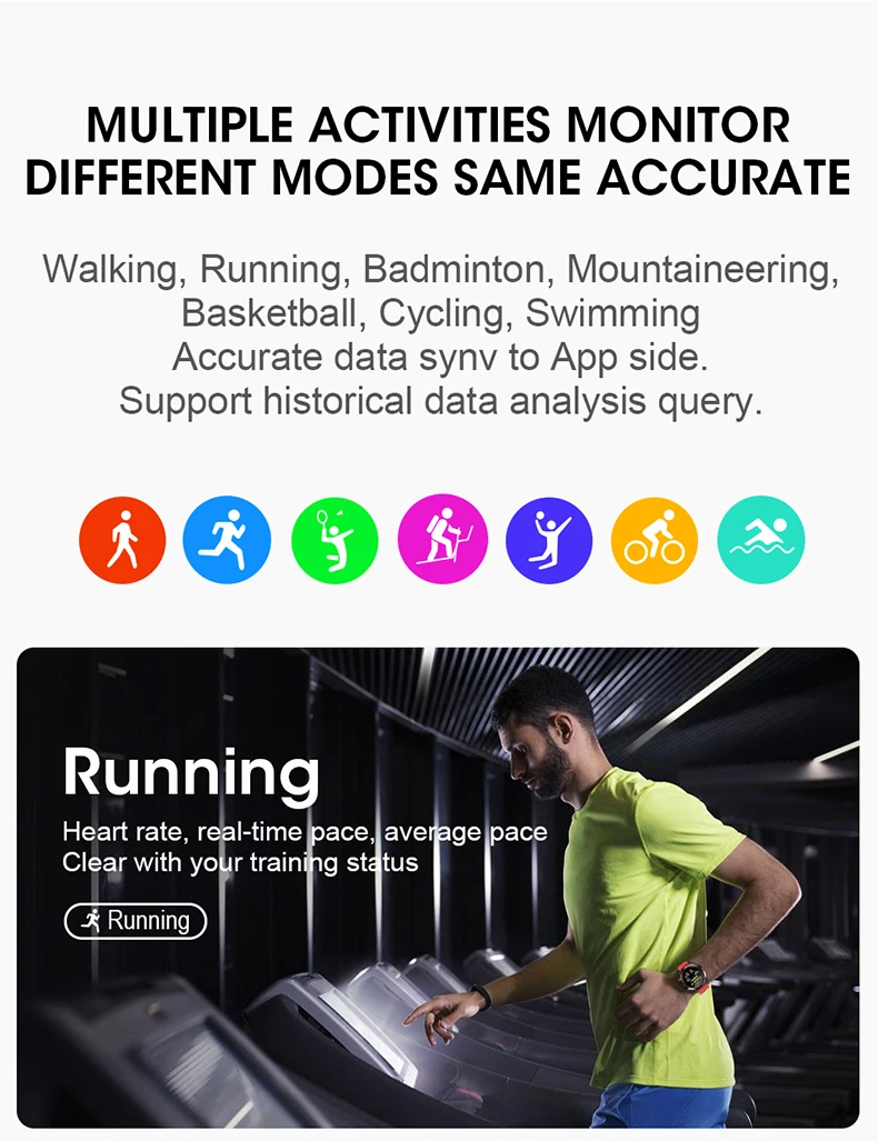 Встроенная Профессиональная обработка данных анализа для различных спортивных режимов. Оставайтесь активными и положительными, Отслеживайте все мероприятия, которые у вас есть, профессиональные датчики движения. Автоматически Отслеживайте свою активность, помогите сфокусироваться и наслаждайтесь упражнениями.