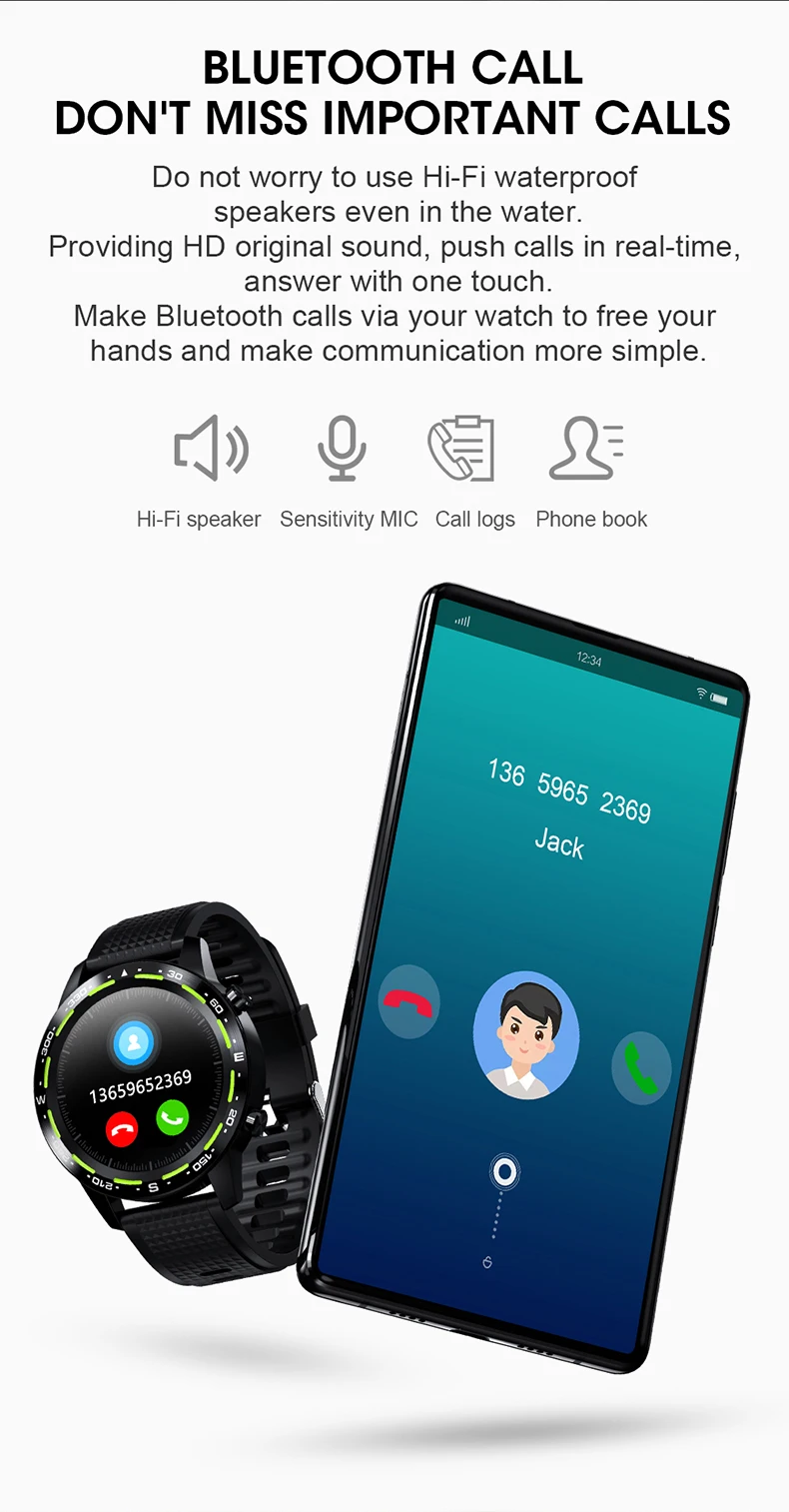 Не беспокойтесь, чтобы использовать Hi-Fi водонепроницаемые колонки даже в воде Обеспечивающий оригинальный звук HD, push-звонки в режиме реального времени, ответ одним касанием Сделайте вызовы по Bluetooth через часы, чтобы свободные руки и сделать связь более простой