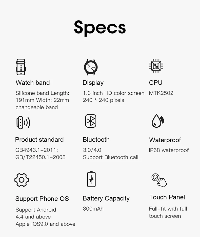Чипсет: MTK2502D (ОЗУ 32 Мб + 32 Мб, частота МГц) Тип продукта: часы Smarat Чехол для часов: сплав Ремешок для часов: силиконовый (УФ-светильник, антистатическая обработка) Зарядка: магнитное зарядное устройство (один час/200 мАч) Основной экран: IPS 1,54hd, 240*240 (от квадратного до круглого) Сенсорный экран: емкостный, полностью подходящий сенсорный экран Версия Bluetooth: 3,0, 4,0, поддержка звонков buletooth Аккумулятор: 300 мАч Вибрация: Поддержка