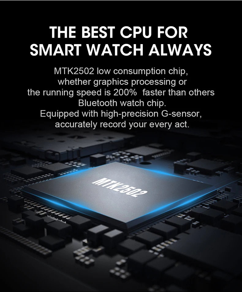 Чип MTK2502 с низким энергопотреблением, независимо от того, работает ли графическая обработка, скорость работы на 200% быстрее, чем у других Bluetooth чип для часов Оснащенный высокоточным G-датчиком, точно записывающий каждый Ваш поступок