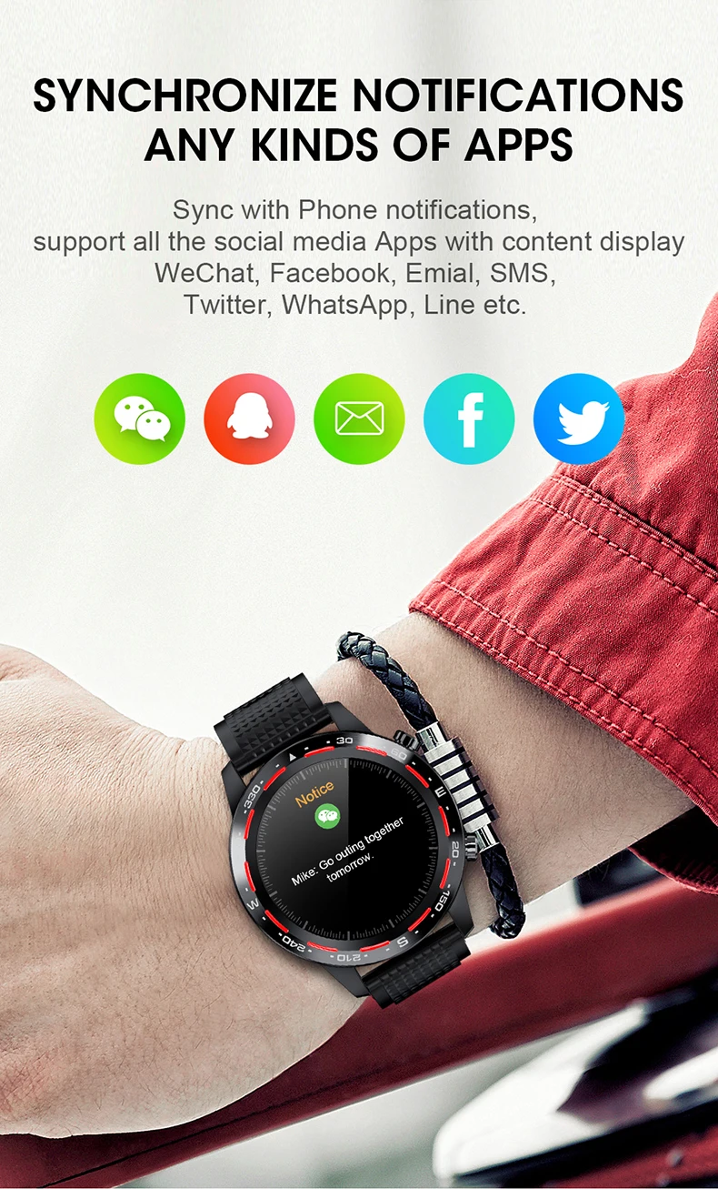 Синхронизация с уведомлениями о телефоне, поддержка всех приложений для соцсетей с дисплеем содержания Wechat. Facebook электронной почты SMS Twitter, Whatsapp, Line и т. Д.