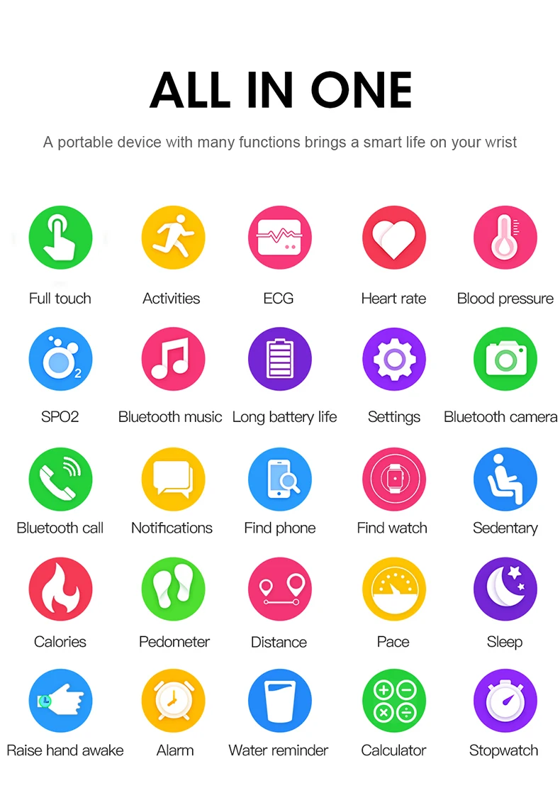 SBluetooth звонки, пульсометр, ЭКГ, кровяное давление, кислород, шаги, несколько спортивных режимов, водонепроницаемый moIP68 Уведомление: звонки, SMS, электронная почта, WhatsApp, Facebook и т. Д. Сердечник: 24 часа непрерывной монитор ЭКГ: ЭКГ анализа данных Шагомер: измеритель движения, расход калорий, запись пробега Напоминание о малоподвижности: время упражнений и изменение нездорового образа жизни Монитор сна: Включите 9PM и выключите 9AM автоматически контролирует состояние сна Функция поиска мобильного телефона: напоминание о потере. Двухсторонний поиск Bluetooth музыка: управление музыкой вашего телефона Напоминание о вызове: Поддержка Другие функции: будильник, календарь, секундомер, калькулятор