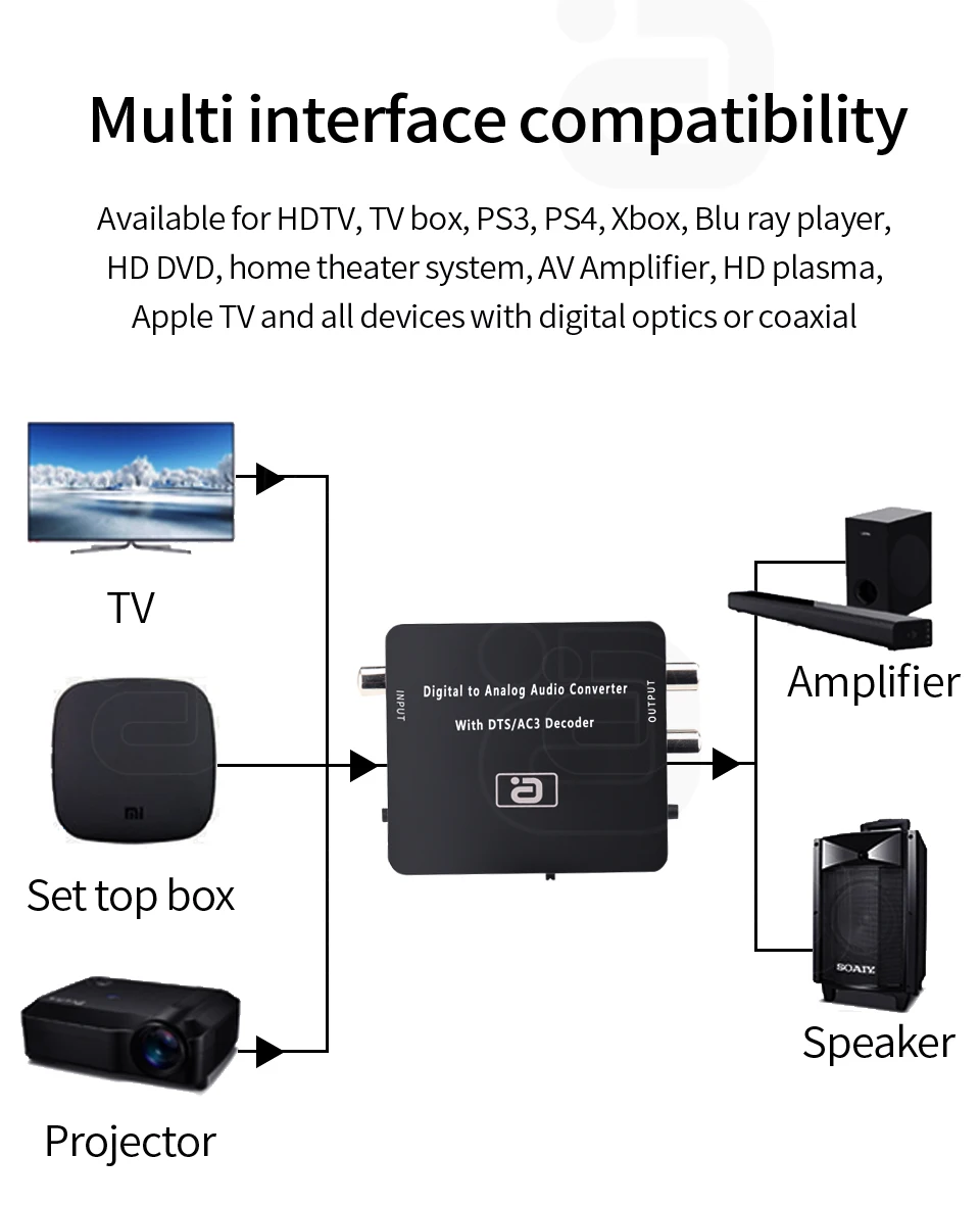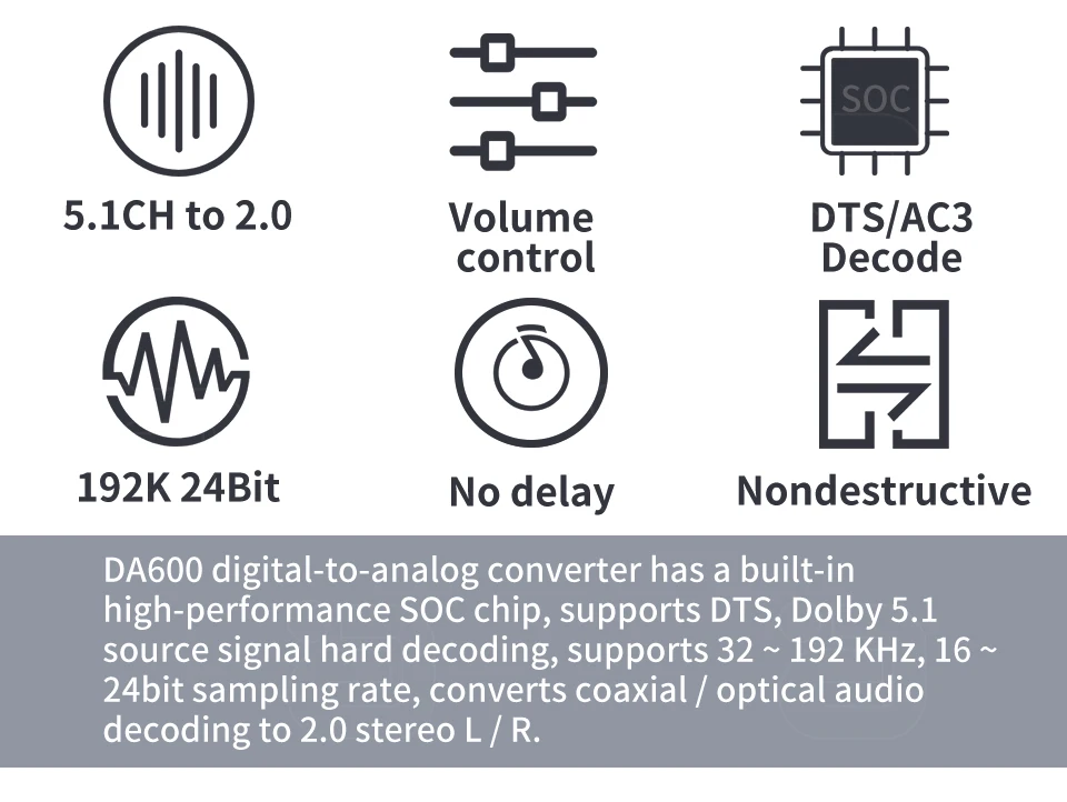 Что делать, если вы играете в игры, которая является конкурентоспособной, но не имеет звука? Как жаль! Есть ли новый HD телевизор, который любит 3d-фильмы, но не может подключаться к старому стереозвуку? Система домашнего кинотеатра поддерживает True HD / DTS / Dolby AC3 / LPCM/PCM, но интерфейс между устройствами не сравним? Этот цифровой и аналоговый аудио декодер DA600 действительно может помочь вам решить все эти проблемы. Вы можете получить аудио с телевизора/PS4/blu ray / Xbox / roku на любой аудиоресивер, который вам нужен (аудио/усилитель/гарнитура). Особенности продукта: [Цифровое аналоговое преобразование] этот преобразователь DAC преобразует коаксиальные или оптические цифровые аудиосигналы в аналоговый стереозвук L/R 2.0ch и может быть подключен к внешним приборам, таким как усилители, через стандартный разъем типа RCA, вы также можете выбрать разъем для наушников 3,5 мм (конверсии), выход, подключение наушников высокой точности, идеально подходит для домашнего или профессионального переключения звука. 【 DTS / Dolby AC3, 5.1CH и 2.0CH аудио декодирование 】встроенный чип SOC высокой производительности CS4354, поддержка True HD / DTS / Dolby AC3 / LPCM / PCM форматов, совместимых с устройствами, работающими на расстоянии до 2 МП. [Поддерживает регулировку громкости] Регулировка громкости на уровне 20 позволяет эффективно решить проблему уменьшения громкости и громкости источника звука, которые не могут регулироваться наушниками/звуками. Поддерживает регулятор громкости. [Поддержка 192K_24bit Loseless decode】поддерживает частоту дискретизации на 32, 44,1, 48, 96 и 192 кГц, и 16 ~ 24 бит S/PDIF входящий поток бит на левых и правых каналах. Примечание: Перед установкой убедитесь, что все устройства, которые вы хотите подключить, выключены. 1) Подключите устройство источника звука к конвертеру с помощью подходящего Toslink или коаксиального кабеля. Переключение между циферблатом. 2). Подключите av-приемники или усилители к конвертеру с помощью подходящего кабеля R/L. Технические характеристики Диапазон частот образцов DSP... 24b ~ 192 кГц Диапазон битов DSP..., 16 ~ 24 бит Уровень аналогового выхода (1 кГц @ 0 дБ)... ③ 1,5 В RMS SNR @ 0 дБ (CCIR/ARM)... ③ 90 дБ Частотная характеристика..., 20 Гц ~ 20 кГц Максимальный рабочий ток....... 200 мА Адаптер питания формат входного сигнала..... DC-5V/500 мА Товар (Д x Ш x В)....... 72x55x20 Производим вес........ 40 г Посылка, содержимое 1x DA600 1x USB кабель питания 1x адаптер питания 1x оптический или коаксиальный кабель 1x3,5 мм разъем для 2x RCA