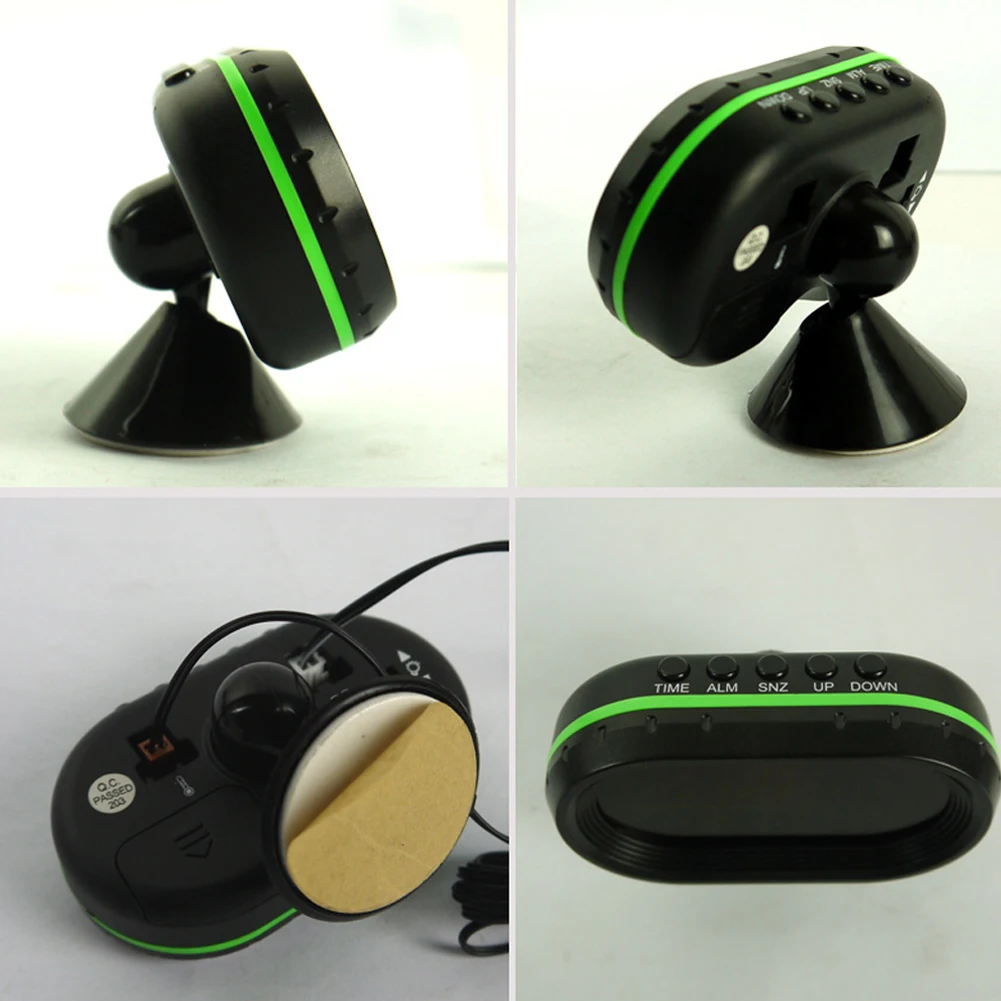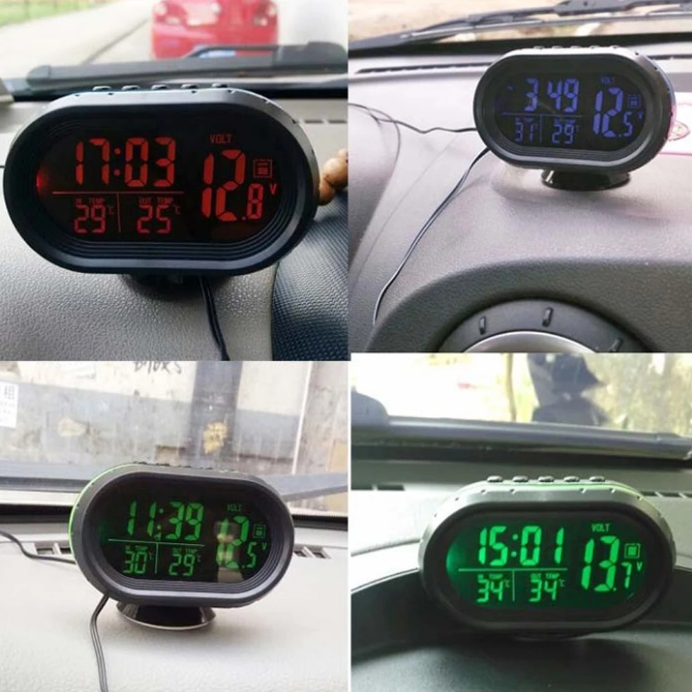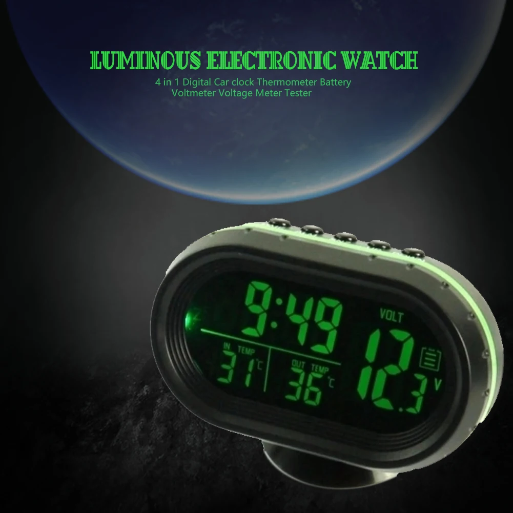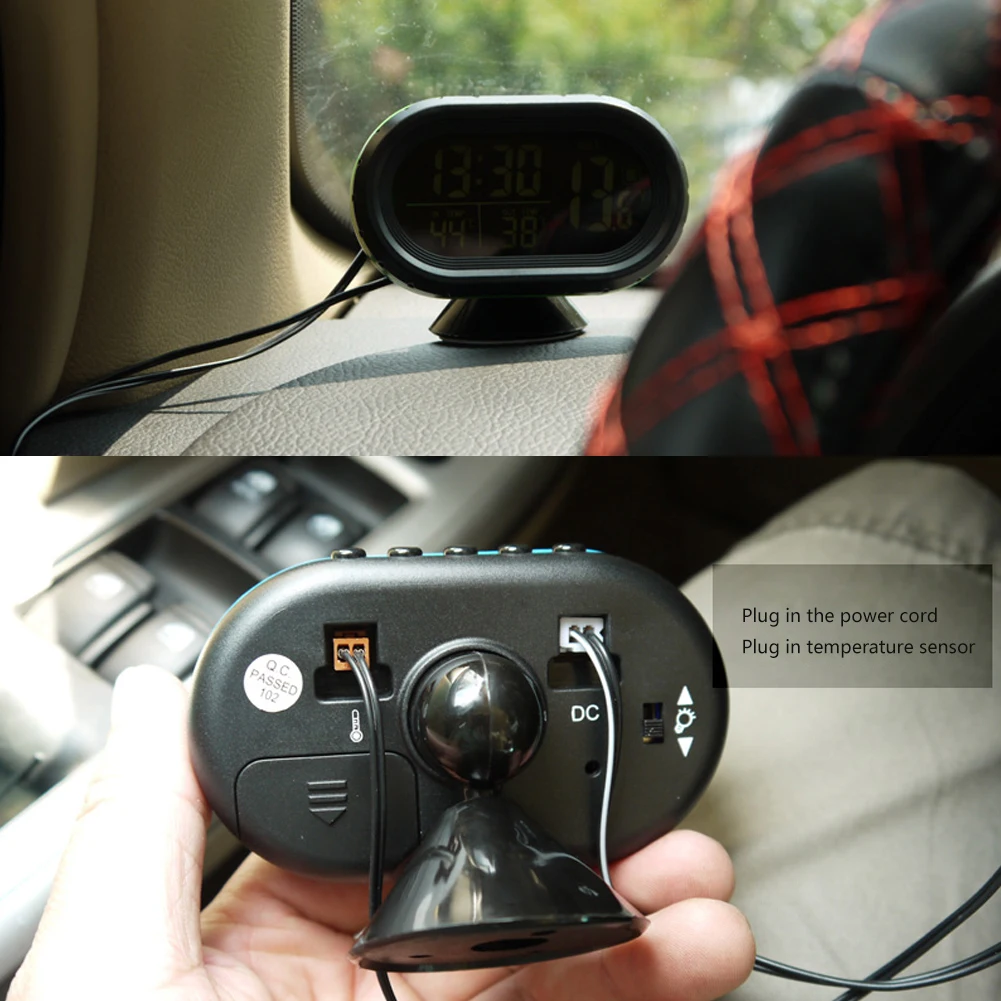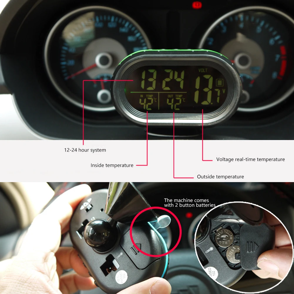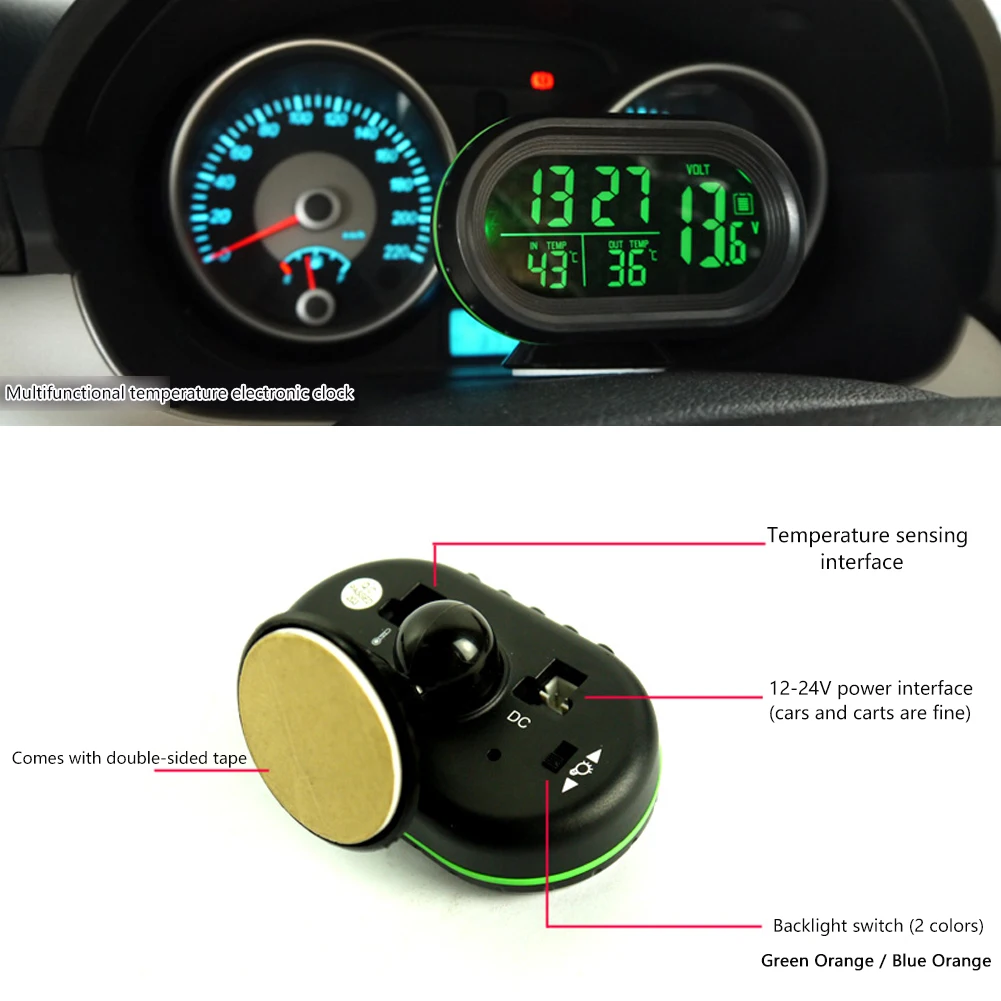 Отображение времени/даты, 12 / 24 часовое преобразование системы. Возможность переключения температурного дисплея градусов Цельсия/Фаренгейта. Питание от автомобильного прикуривателя или 2 батарей LR44. Отображение точных показаний температуры внутри и снаружи автомобиля. Оповещает вас о напряжении аккумулятора автомобиля и его датчике тревоги уведомляет вас о чрезмерном или нормальном напряжении. Светодиодный дизайн подсветки позволяет точно считывать цифры в темноте. Простота установки и использования, идеальный аксессуар для вашего автомобиля.Спецификация: