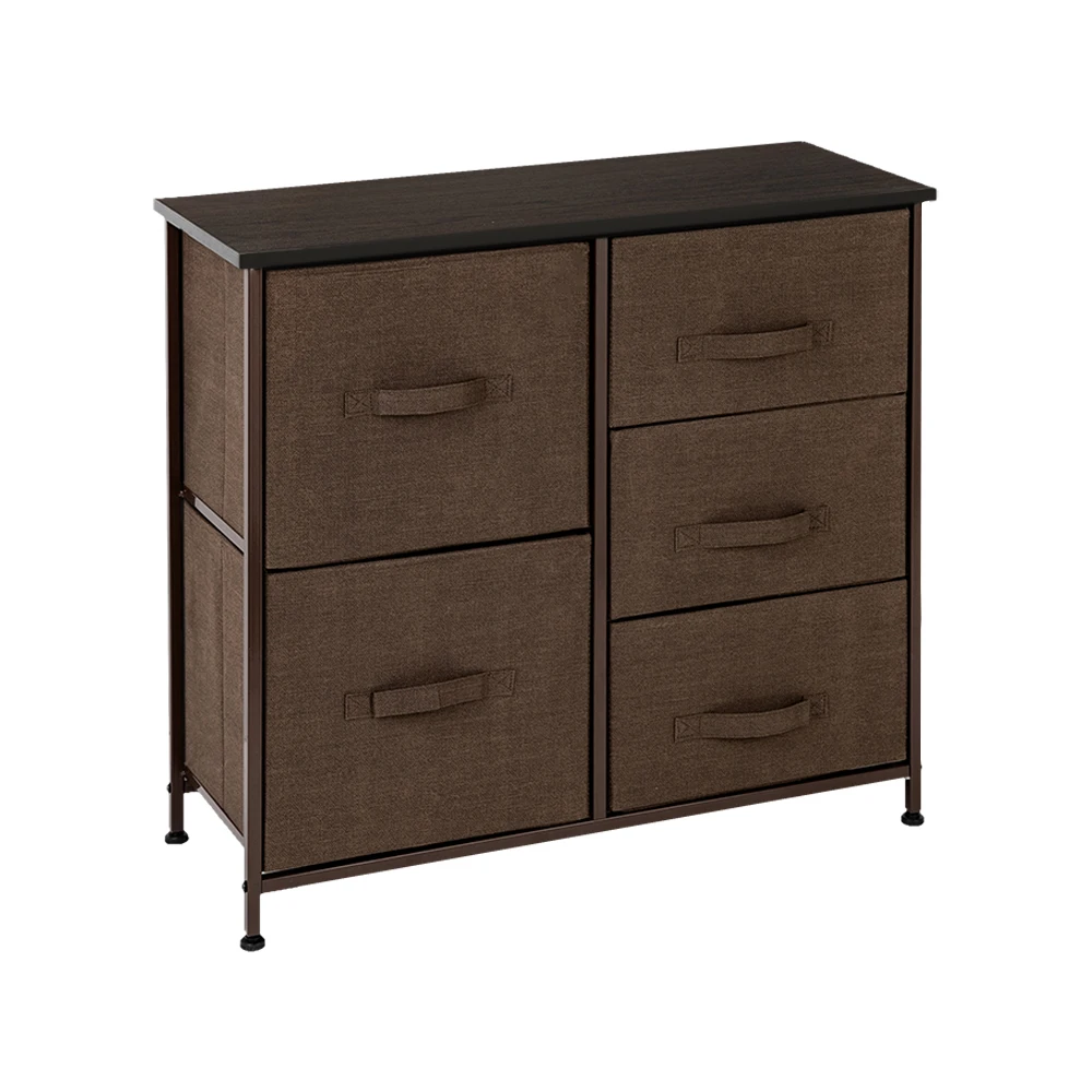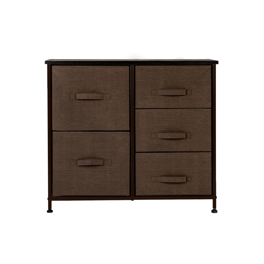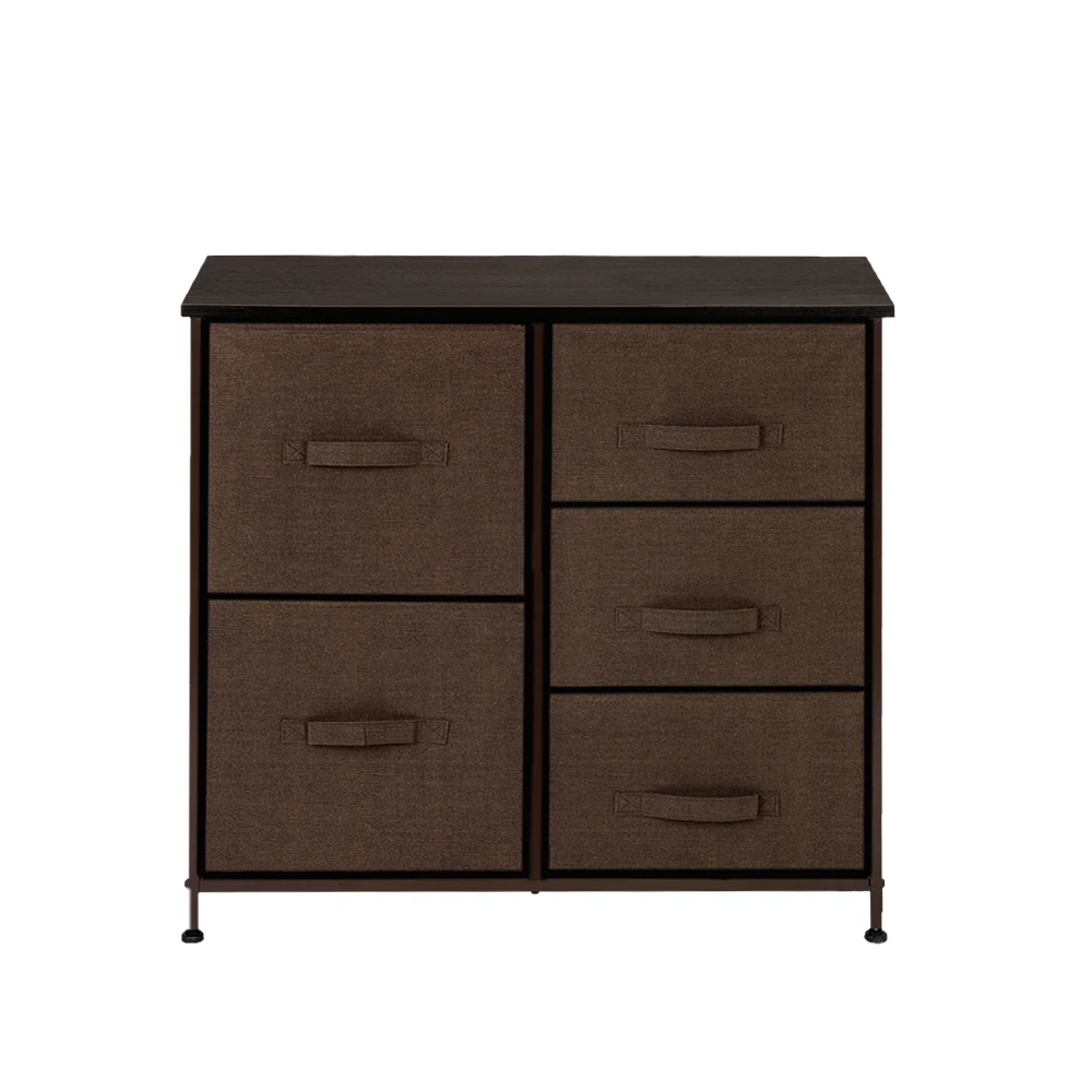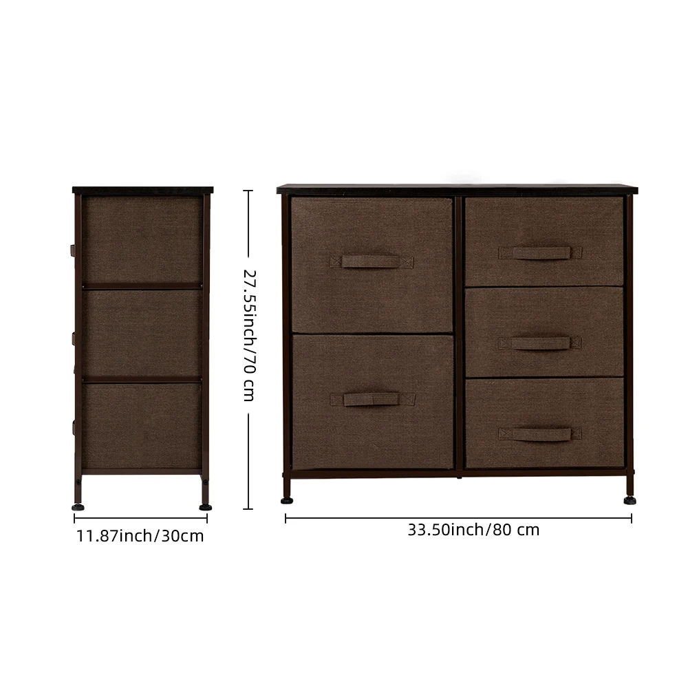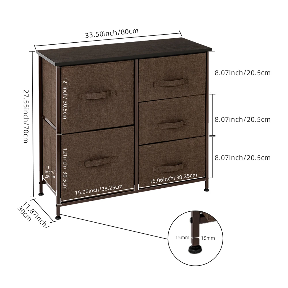"Introductions: Give Your Household Essentials A Cozy Landing Spot With The 5-Drawer Dresser. This Beautiful Dresser Chest Features A Tabletop Surface And Pull-Out Drawers To Tuck Away Household Clutter. The Thoughtful Design Is Great For Small Living Spaces And Works Equally Well Near The Bed Or Sofa. Organization Enthusiasts Will Enjoy Filling Each Drawer With Clothing, Linens, And Knick-Knicks From Around The Home. The Lightweight Frame Makes This Unit Easy To Transport And When Not In Use, Simply Fold The Fabric Drawers Flat For Storage. Use Alone As A Single Unit Or Pair With Any Drawer Configuration From The Furniture Collection. Features: 1. Restore A Tidy Home: Bits And Pieces Scattered Everywhere In Your Home? With These 5 Removable Drawers You Can Sort Items By Type; Easily Tame The Mess And Bring Back The Fresh Feeling To Your Sweet Home 2. When Fabric Meets Rigid Metal: A Perfect Mix Bringing Its Strengths Into Full Play - Iron Frame Offers Stable Support For Fabric Boxes, And The Fabric Element Adds A Soft And Warm Touch To The Metal-Framed Dresser Drawer, And Is More Lightweight To Move 3. Every Room Scrambles For It: The Cloakroom Wants It As A Cabinet To Offer A Home For Workout Gear, Leggings And Pajamas; The Nursery Wants A Chest Of Drawers To Stow Baby Stuff; The Entryway Wants A Space Saving Storage Unit For Coming And Going Things; Whats Your Plan 4. Stability Comes First: Crafted With A Wooden Tabletop And Metal Frame, The Dresser Is Stable And Durable And Holds Up To 66 Pounds. 4 Adjustable Feet Allow You To Use It On Uneven Surfaces And Adds Extra Stability 5. Easy To Assemble: With A Simple Structure, Its A Breeze To Assemble The Storage Unit. Simply Fix The Screws In Position And Unfold The 5 Drawers And Its Ready To Tame The Mess Note: 1.When receiving the goods, please confirm the product according to the listing of instructions. Once you find Less pieces, please provide relevant pictures to contact us. We will deal it in the time. 2.Please install goods with the instruction manual. 3.It is recommended that the installation should not be too tight to adjust easily. After the structure is installed, firm the interface for more stability. Specifications: 1. Color: Brown 2. Material: MDF(Medium Density Fiberboard), Iron, Non-woven Fabric 3. Frame Dimension: (33.50 x 11.87 x 27.55 ) / (80 x 30 x 70)cm (L x W x H) 4. Drawer Dimension: (14.17 x 10.63 x 11.81) / (36 x 27 x 30)cm (L x W x H) / (14.17x 10.63 x 7.87) / (36 x 27 x 20)cm (L x W x H) 5. Drawers: 5drawer 6. Product Care: Wipe clean with a wet cloth and let it dry 7. Product Weight: 17.75lb / 8.05kg 8. Load Capacity: 66lb / 30kg 9. Static Load Capacity of the Shelf: 33lb / 15kg 10. Static Load Capacity of Each Drawer: 11lb / 5kg Package Includes: 1 x Drawer Storage Dresser 1 x Assembling Tool Kit 1 x Instructions "