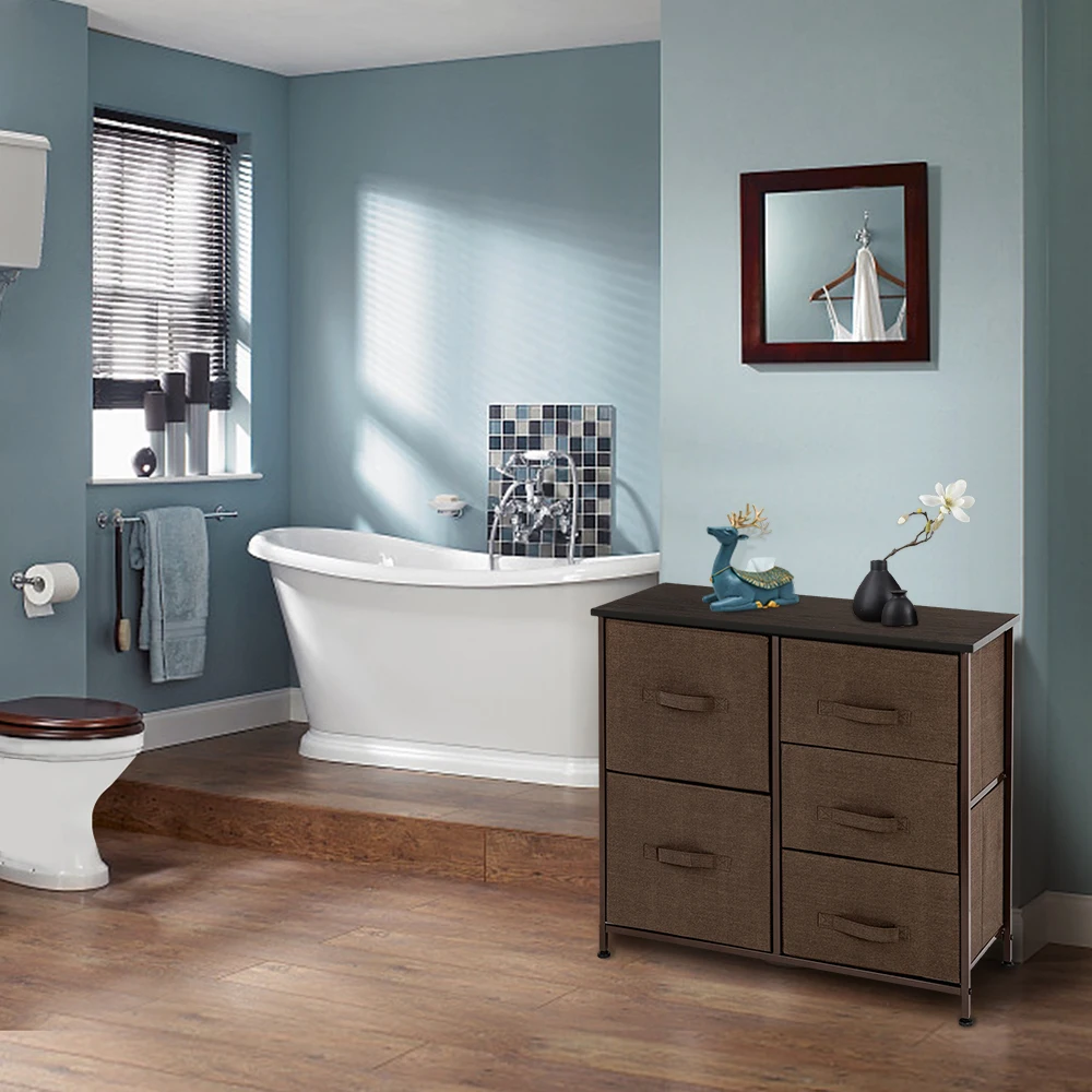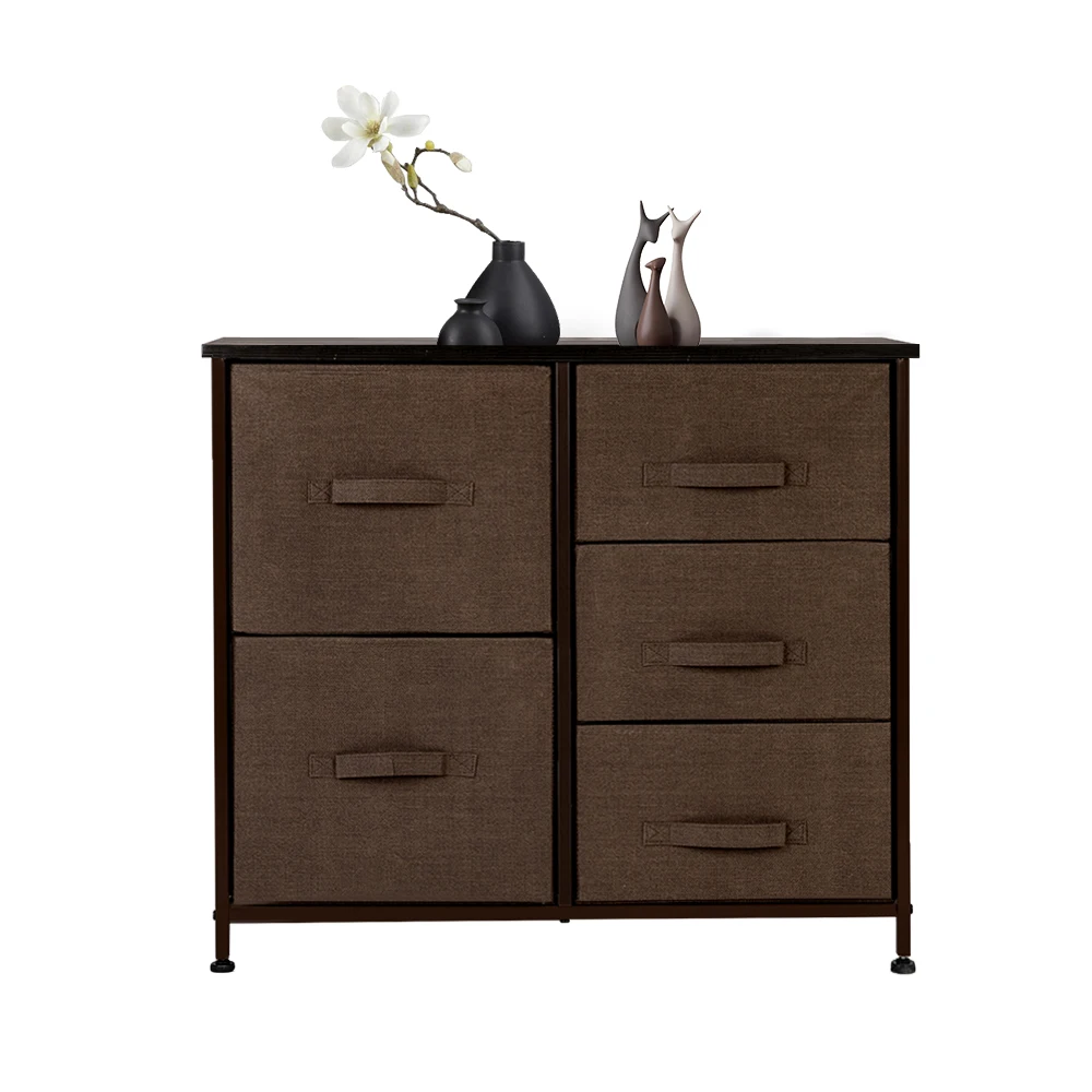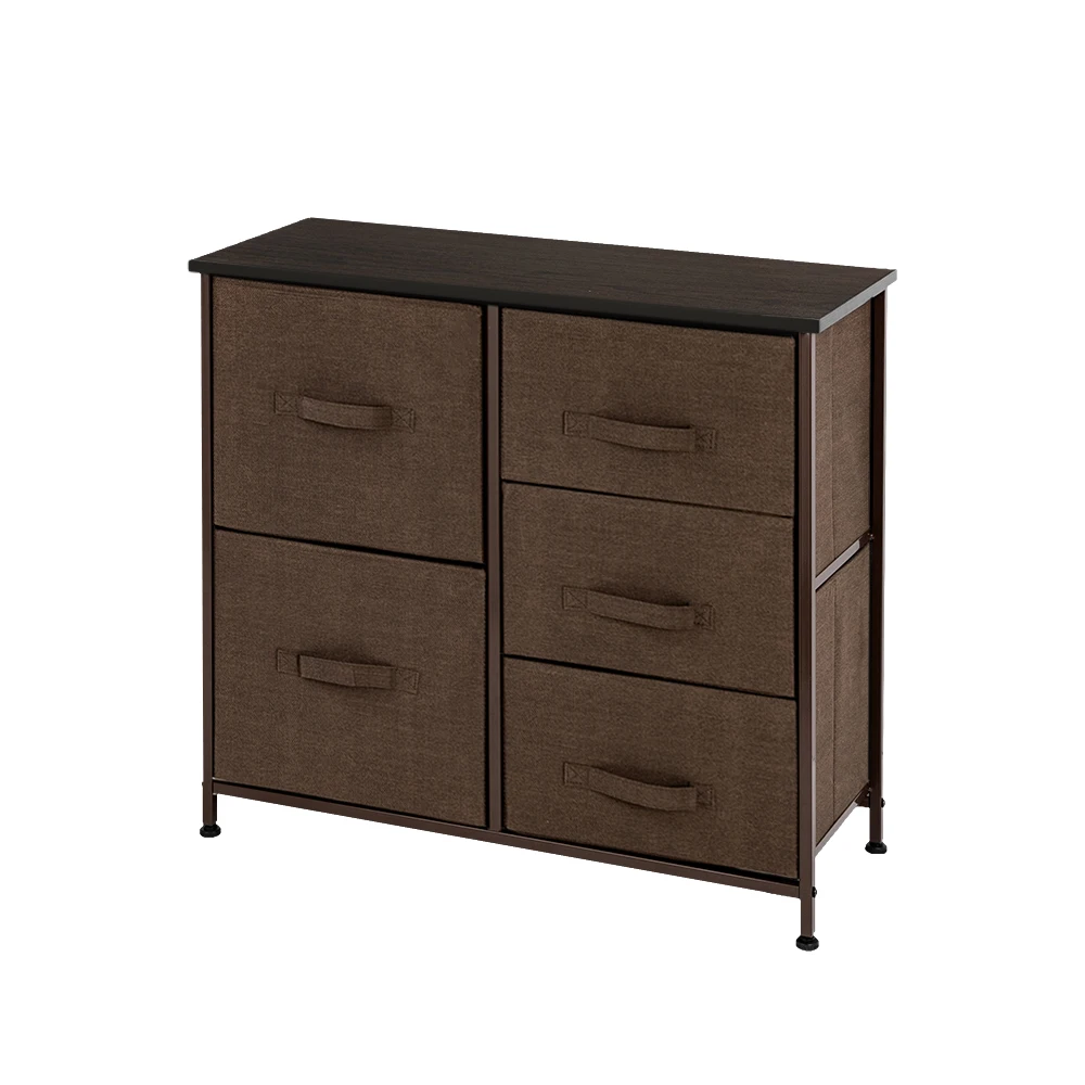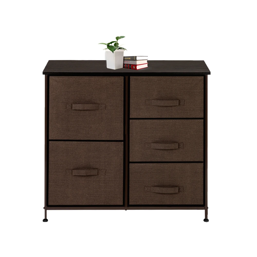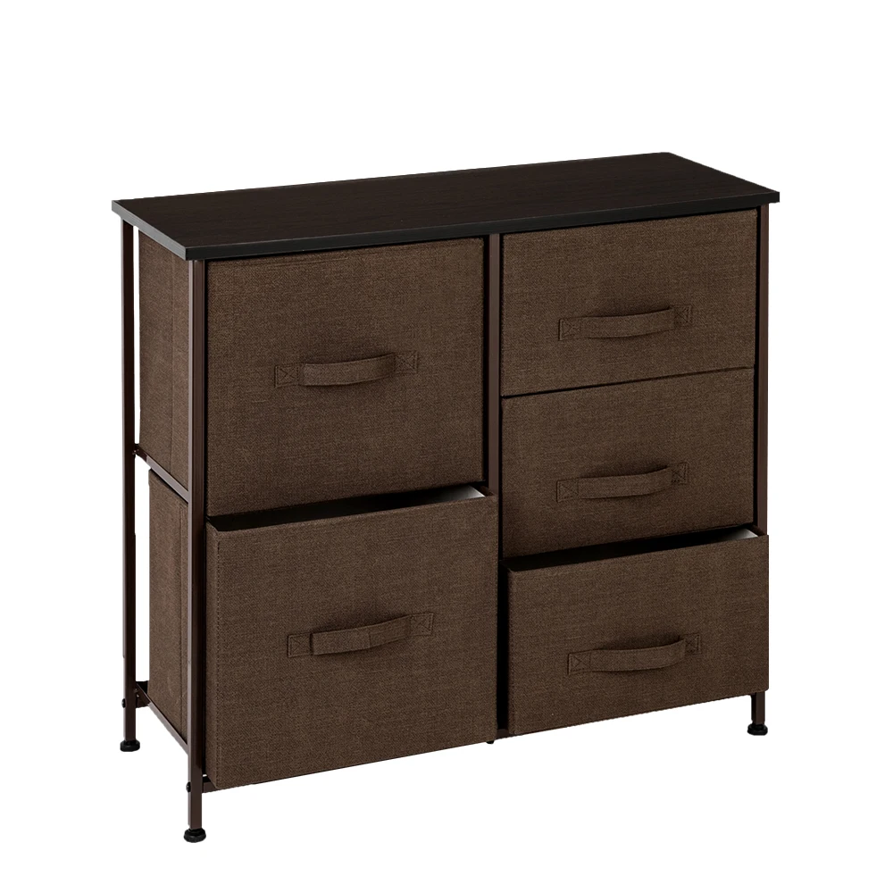 "Introductions: Give Your Household Essentials A Cozy Landing Spot With The 5-Drawer Dresser. This Beautiful Dresser Chest Features A Tabletop Surface And Pull-Out Drawers To Tuck Away Household Clutter. The Thoughtful Design Is Great For Small Living Spaces And Works Equally Well Near The Bed Or Sofa. Organization Enthusiasts Will Enjoy Filling Each Drawer With Clothing, Linens, And Knick-Knicks From Around The Home. The Lightweight Frame Makes This Unit Easy To Transport And When Not In Use, Simply Fold The Fabric Drawers Flat For Storage. Use Alone As A Single Unit Or Pair With Any Drawer Configuration From The Furniture Collection. Features: 1. Restore A Tidy Home: Bits And Pieces Scattered Everywhere In Your Home? With These 5 Removable Drawers You Can Sort Items By Type; Easily Tame The Mess And Bring Back The Fresh Feeling To Your Sweet Home 2. When Fabric Meets Rigid Metal: A Perfect Mix Bringing Its Strengths Into Full Play - Iron Frame Offers Stable Support For Fabric Boxes, And The Fabric Element Adds A Soft And Warm Touch To The Metal-Framed Dresser Drawer, And Is More Lightweight To Move 3. Every Room Scrambles For It: The Cloakroom Wants It As A Cabinet To Offer A Home For Workout Gear, Leggings And Pajamas; The Nursery Wants A Chest Of Drawers To Stow Baby Stuff; The Entryway Wants A Space Saving Storage Unit For Coming And Going Things; Whats Your Plan 4. Stability Comes First: Crafted With A Wooden Tabletop And Metal Frame, The Dresser Is Stable And Durable And Holds Up To 66 Pounds. 4 Adjustable Feet Allow You To Use It On Uneven Surfaces And Adds Extra Stability 5. Easy To Assemble: With A Simple Structure, Its A Breeze To Assemble The Storage Unit. Simply Fix The Screws In Position And Unfold The 5 Drawers And Its Ready To Tame The Mess Note: 1.When receiving the goods, please confirm the product according to the listing of instructions. Once you find Less pieces, please provide relevant pictures to contact us. We will deal it in the time. 2.Please install goods with the instruction manual. 3.It is recommended that the installation should not be too tight to adjust easily. After the structure is installed, firm the interface for more stability. Specifications: 1. Color: Brown 2. Material: MDF(Medium Density Fiberboard), Iron, Non-woven Fabric 3. Frame Dimension: (33.50 x 11.87 x 27.55 ) / (80 x 30 x 70)cm (L x W x H) 4. Drawer Dimension: (14.17 x 10.63 x 11.81) / (36 x 27 x 30)cm (L x W x H) / (14.17x 10.63 x 7.87) / (36 x 27 x 20)cm (L x W x H) 5. Drawers: 5drawer 6. Product Care: Wipe clean with a wet cloth and let it dry 7. Product Weight: 17.75lb / 8.05kg 8. Load Capacity: 66lb / 30kg 9. Static Load Capacity of the Shelf: 33lb / 15kg 10. Static Load Capacity of Each Drawer: 11lb / 5kg Package Includes: 1 x Drawer Storage Dresser 1 x Assembling Tool Kit 1 x Instructions "