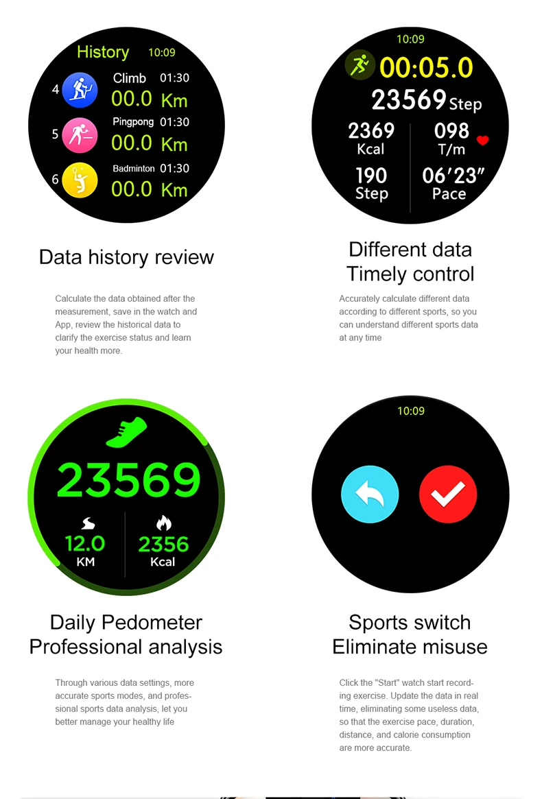 Нажмите кнопку «СТАРТ», чтобы начать запись. Обновите данные в режиме реального времени, устраняя некоторые бесполезные данные, так что упражнения темп. Длительность и потребление калорий являются более точными.