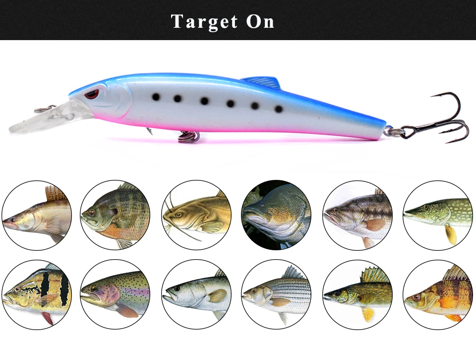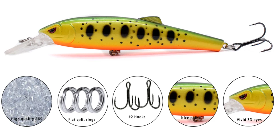 Каждая наша приманка была изготовлена из экологически безопасного высококачественного АБС-пластика и других прочных аксессуаров, таких как прочные крючки, провода, сплит-кольца. Каждая наживка имеет тяжелое пальто с выдающимся цветом отделки. Как приманка, она копирует приманку рыбы и имеет жизнь, как плавать действий. Имитирующий естественный цвет и волшебные цвета ручной краски подходят для любой рыбалки в пресной или соленой воде.