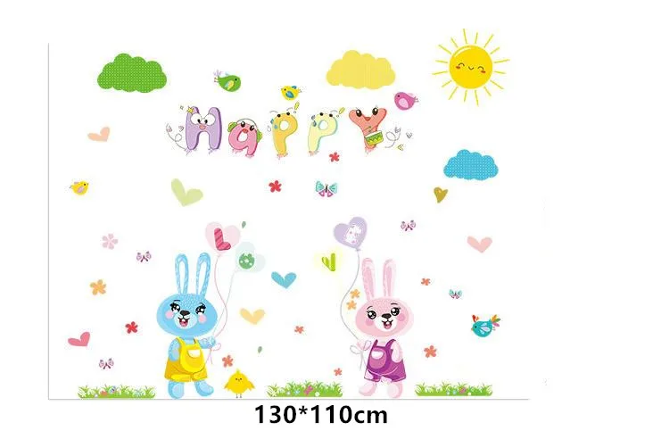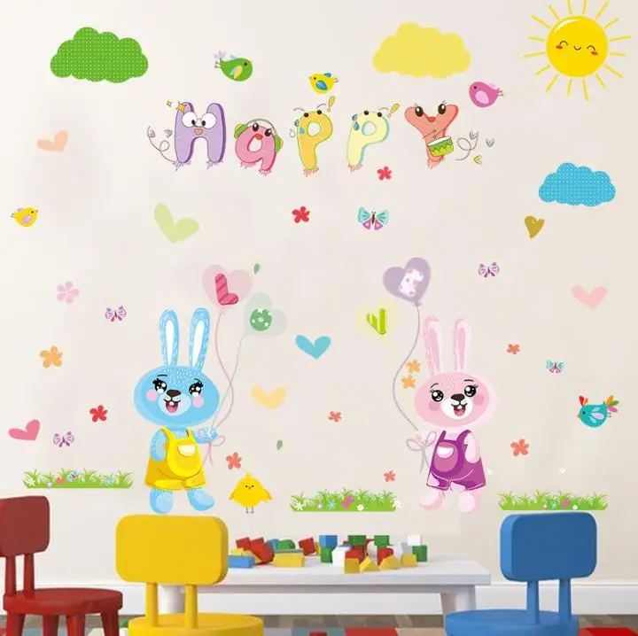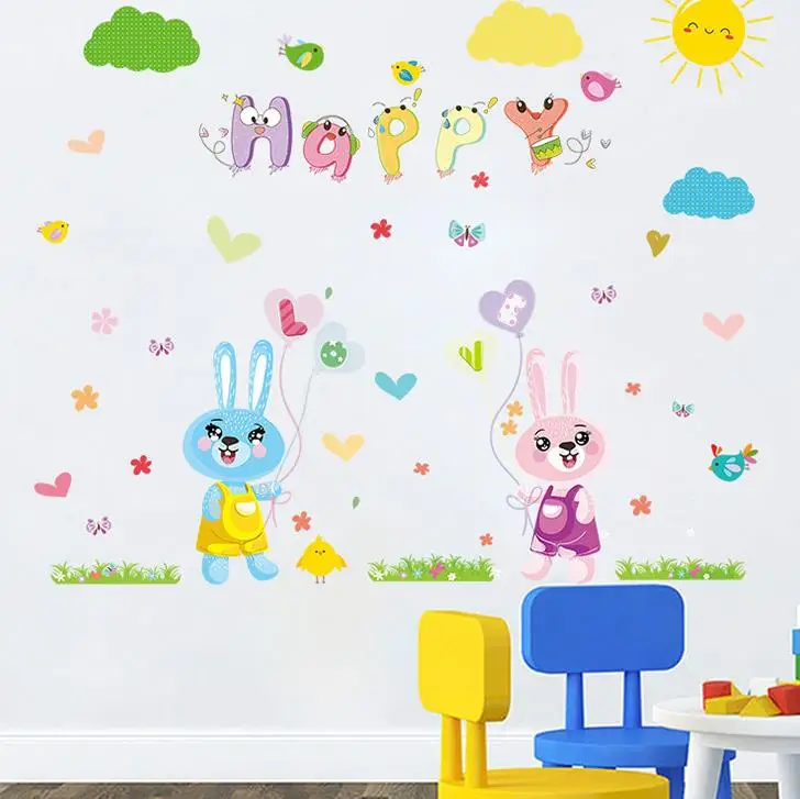 Cartoon Lovely Rabbit Happy Words Wall Stickers Baby for Kids Rooms Wall Decal Bedroom Living Room Decor Wall Stickers