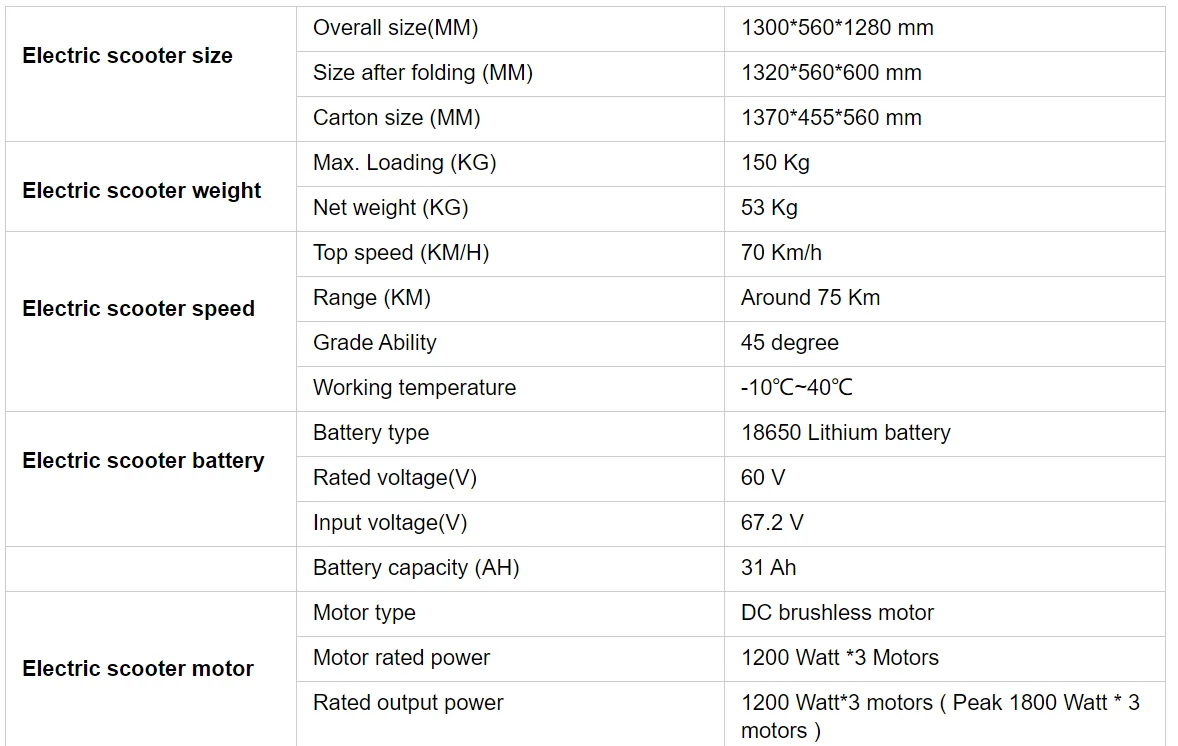 Топ-версия Двигатель: 60 в 1200 Вт * 3 передний и задний двухприводный двигатель Литиевая батарея: 18650 ячеек 60V 31AH Количество разряда: 1860Wh N.W. : 53 кг Время зарядки (Поддержка двойной зарядки): 5,5-11 часов Максимальная скорость: 70 км/ч Диапазон (Эко) : 75 км Наклон: 45 ° Вес нагрузки: 150 кг