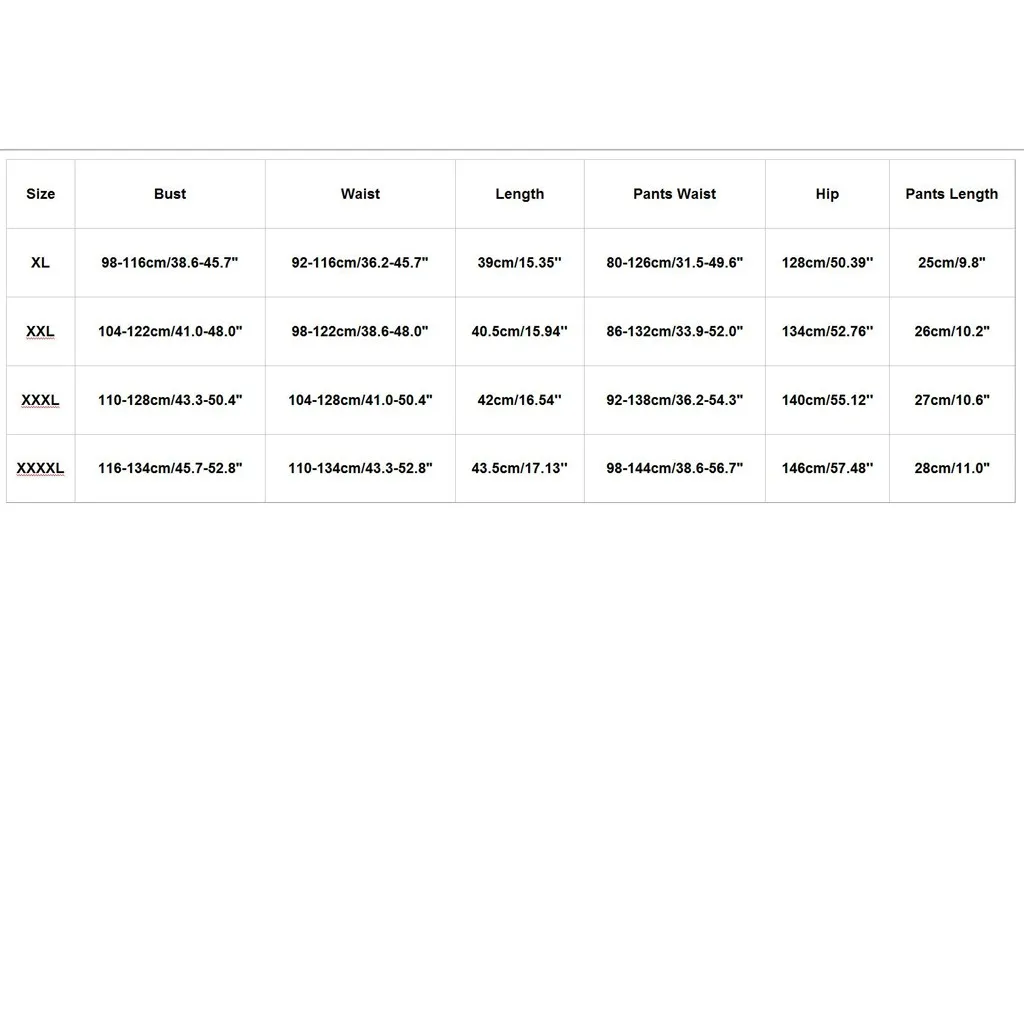 Размер Бюст Талия Длина Брюки на талии Бедра Длина брюк XL 98-116 см/38,6-45,7" 92-116 см/36,2-45,7" 39 см/15,35'' 80-126 см/31,5-49,6" 128 см/50,39'' 25 см/9,8 дюйма XXL 104-122 см/41,0-48,0" 98-122 см/38,6-48,0" 40,5 см/15,94'' 86-132 см/33,9-52,0" 134 см/52,76'' 26 см/10,2 дюйма XХХL 110-128 см/43,3-50,4" 104-128 см/41,0-50,4" 42 см/16,54'' 92-138 см/36,2-54,3" 140 см/55,12'' 27 см/10,6" XXXXL 116-134 см/45,7-52,8" 110-134 см/43,3-52,8" 43,5 см/17,13'' 98-144 см/38,6-56,7" 146 см/57,48'' 28 см/11,0"