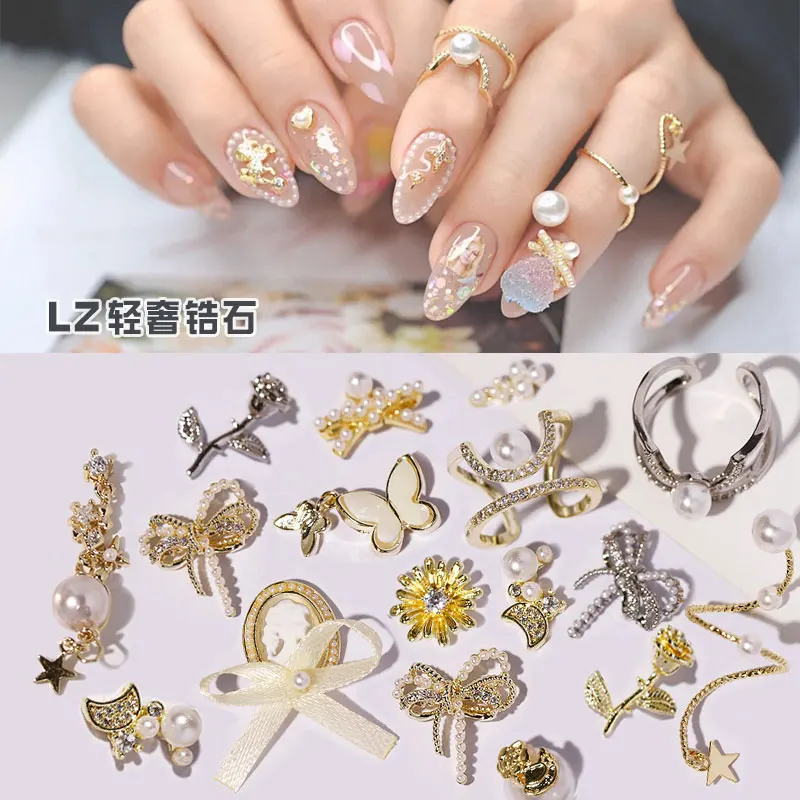 3D Charm Metal Alloy Nail Art Rhinestone Decoration Luxury Pearl Ring Chain Bow Design Nails Zircon Jewelry Manicure Accessories