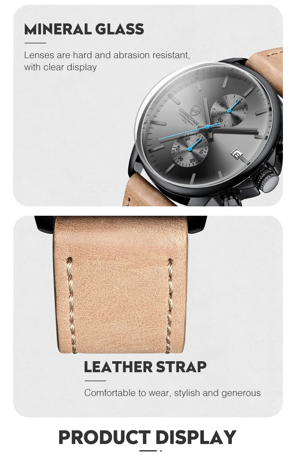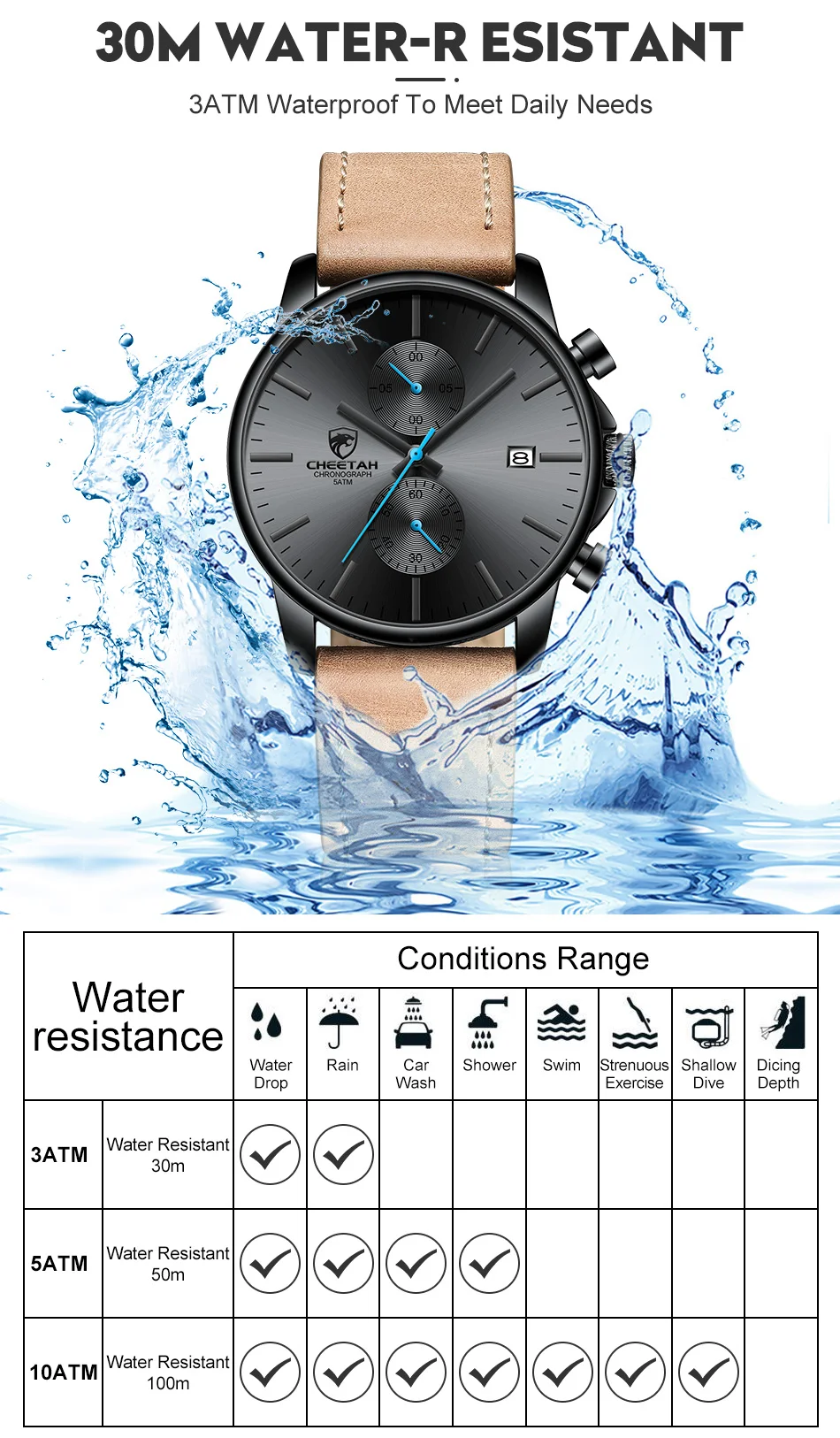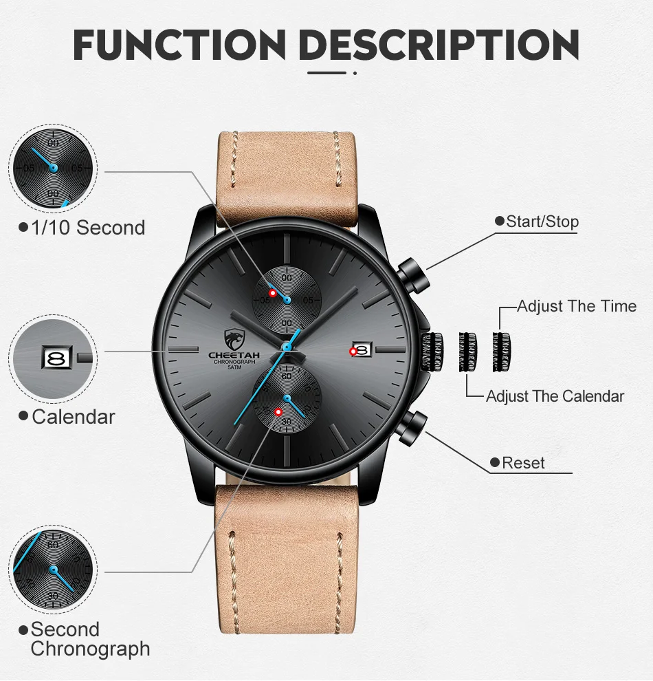 100% новый с биркой и высоким качеством Модные спортивные мужские часы для отдыха Водонепроницаемость (ручная Стирка) Дата Аналоговый дисплей Реальный chronagraph функция Кожаный ремешок высокого качества Технические характеристики Материал корпуса: сплав Чехол Диаметр: 42 мм Чехол Толщина: 12 мм Группа Материал:Кожаный чехолГруппа Длина ремешка: 250 мм (чехол в комплекте) Ширина ремешка: 22 мм Что входит в комплект 100% Гепард абсолютно новые мужские часы 1 x аналоговые модные спортивные мужские часы 1 х Оригинальная фирменная коробка гепарда