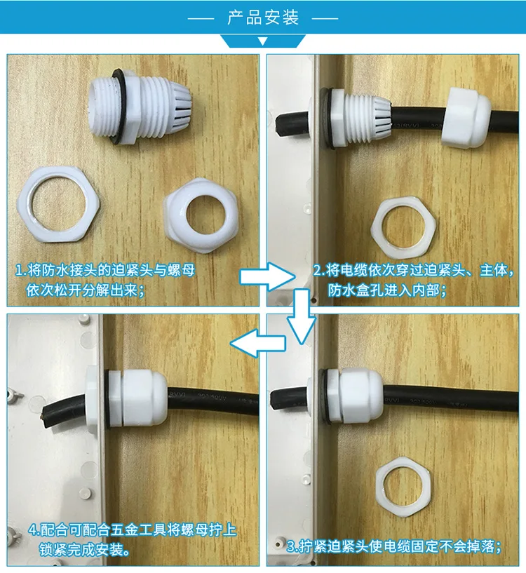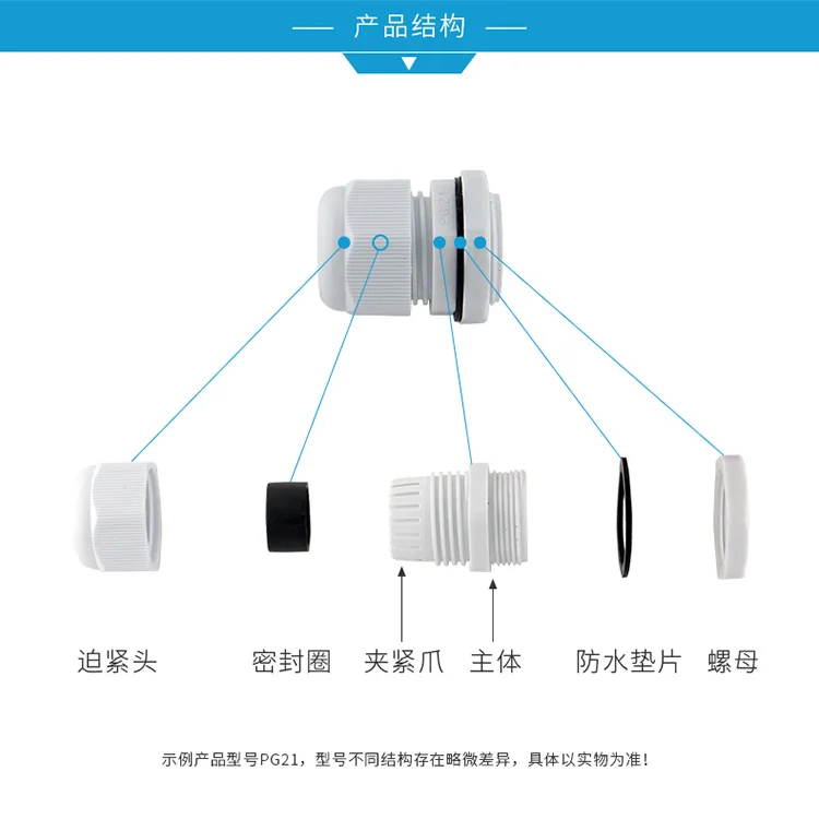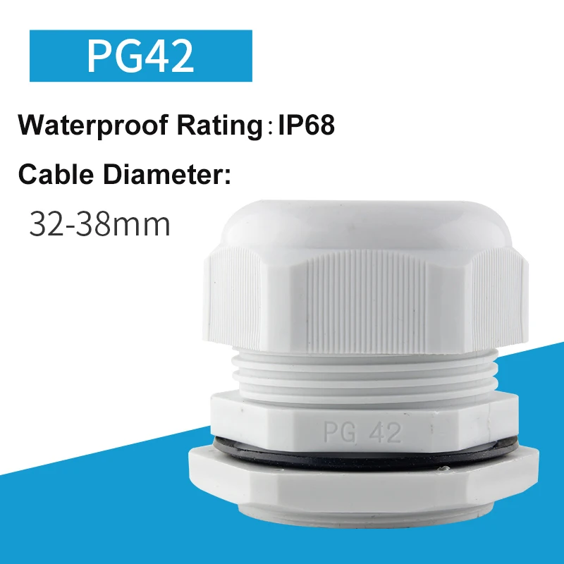 Описание: используется для фиксации кабелей, водонепроницаемый IP68. Специальная конструкция зажимной штамповки и резиновой части, широкий диапазон зажима, сильное растягивающееся сопротивление, без повреждения кабелей и устройств. Без разборки кабель можно вставить напрямую, а затем затянуть легко и сэкономить время. Подходит для коробок управления техникой, распределительных панелей, электрических приборов, машин и т. д. Название продукта: Кабельный сальник; Модель: PG7 PG9 PG11 PG13.5 PG16 PG19 PG21 PG24 PG25 PG29 PG36 PG42 PG48 PG63 Материал: пластик Цвет: белый Посылка: Кабельный сальник-1 шт. Упаковочный лист Кабельный сальник-1 шт.