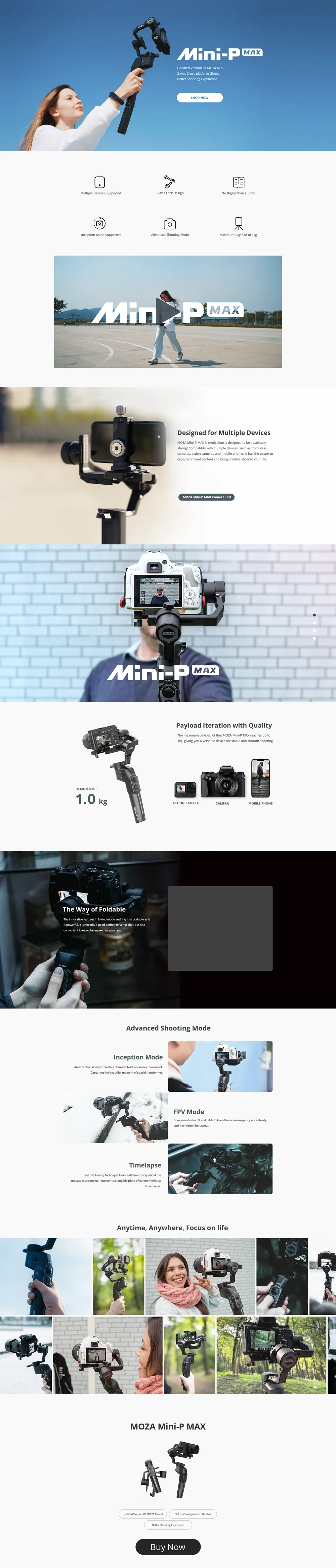 MOZA Mini-P MAXЯвляется кросс-платформенным стабилизатором, совместимым с несколькими устройствами, такими как смартфоны, экшн-камеры, компактные камеры и легкие беззеркальные камеры, что делает его идеальным карданом для путешествий, приключений, кинематографии, или просто захват повседневной жизни.