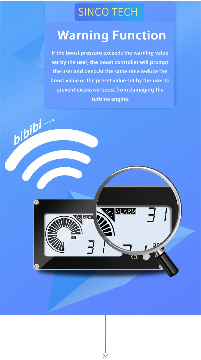 5. Если давление boost превышает значение предупреждения, Установленное пользователем, контроллер boost подскажет пользователю и подаст звуковой сигнал. В то же время Уменьшите значение повышения или заданное значение, Установленное пользователем, чтобы предотвратить чрезмерное повышение от повреждения турбинного двигателя.