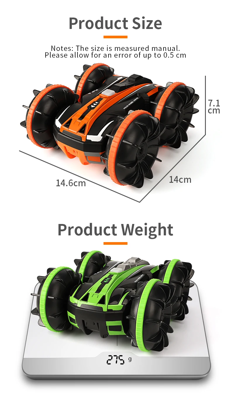Автомобиль-амфибия с дистанционным управлением, четырехколесный привод, вперед и назад, поворот влево и вправо, поворот на месте, может быть перевернут.