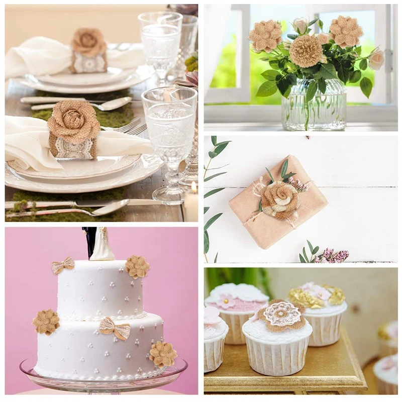 Широкое применение: мешковина с цветами и бантами ручной работы и плоская на спине, легко приклеивается, подходит для винтажный головной убор, заколки для волос, шляпы, броши, приглашения в деревенском стиле, поздравительные открытки, подарочная упаковка, альбом для скрапбукинга; Также может быть применен во многих случаях, таких как деревенская свадьба, Рождество, Вечерние украшения для дома