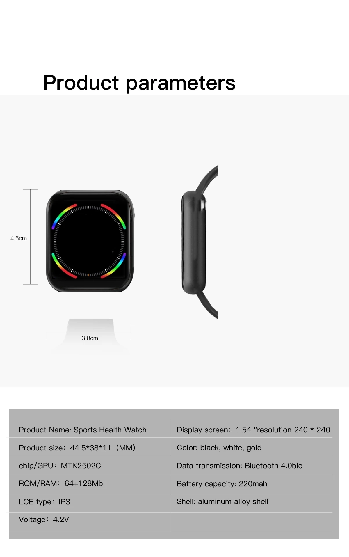* Процессор: MTK2502C * Размер памяти: 64 + 128 Мб * Режим клавиш: Полное касание + жесты + физический ключ * GPS: нет * Версия Bluetooth: BT 4,0 BLE * Один динамик: 0916_BOX независимый динамик звуковой полости * Спецификация батареи: полимерная литиевая батарея 220 мАч * Система: Поддержка Android 4,4 выше и IOS 8,0 выше * IP67 водонепроницаемый, поддерживает ручную стирку, не допускает попадания воды