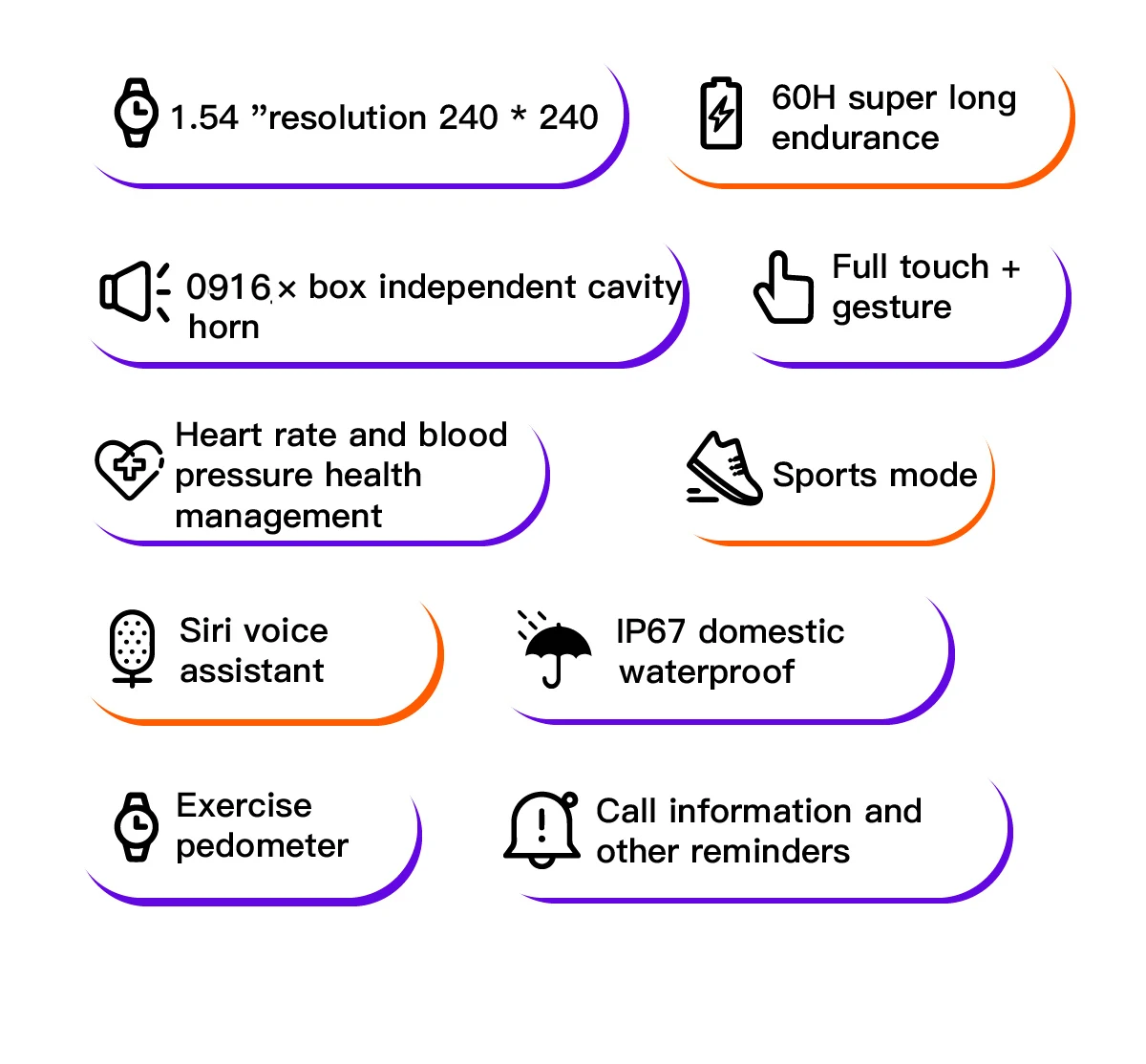 * Шагомер, упражнения, расход калорий, запись пробега * Напоминание о малоподвижности: это зависит от спорта, меняющего нездоровый образ жизни * Мониторинг сна: запись и анализ состояния сна объективно и научно. * Обнаружение частоты сердечных сокращений: он определяет пульс, отражающий светильник. Пожалуйста, носите часы на запястье, чтобы определить значение. Это не профессиональный медицинский прибор, результат только для справки. * Bluetooth Камера: мобильный телефон с дистанционным управлением * Поиск функции мобильный телефон: Предотвращение бросок напоминания * Музыкальный плеер Bluetooth * MP3 кольцо: Поддержка * Информация синхронный sms-контент * Синхронный мобильный телефон адресная книга * Напоминание о звонке: Поддержка * Функция MP3: Поддержка * Функция записи: Поддержка * Будильник: поддержка * Калькулятор: Поддержка * Секундомер: Suppor
