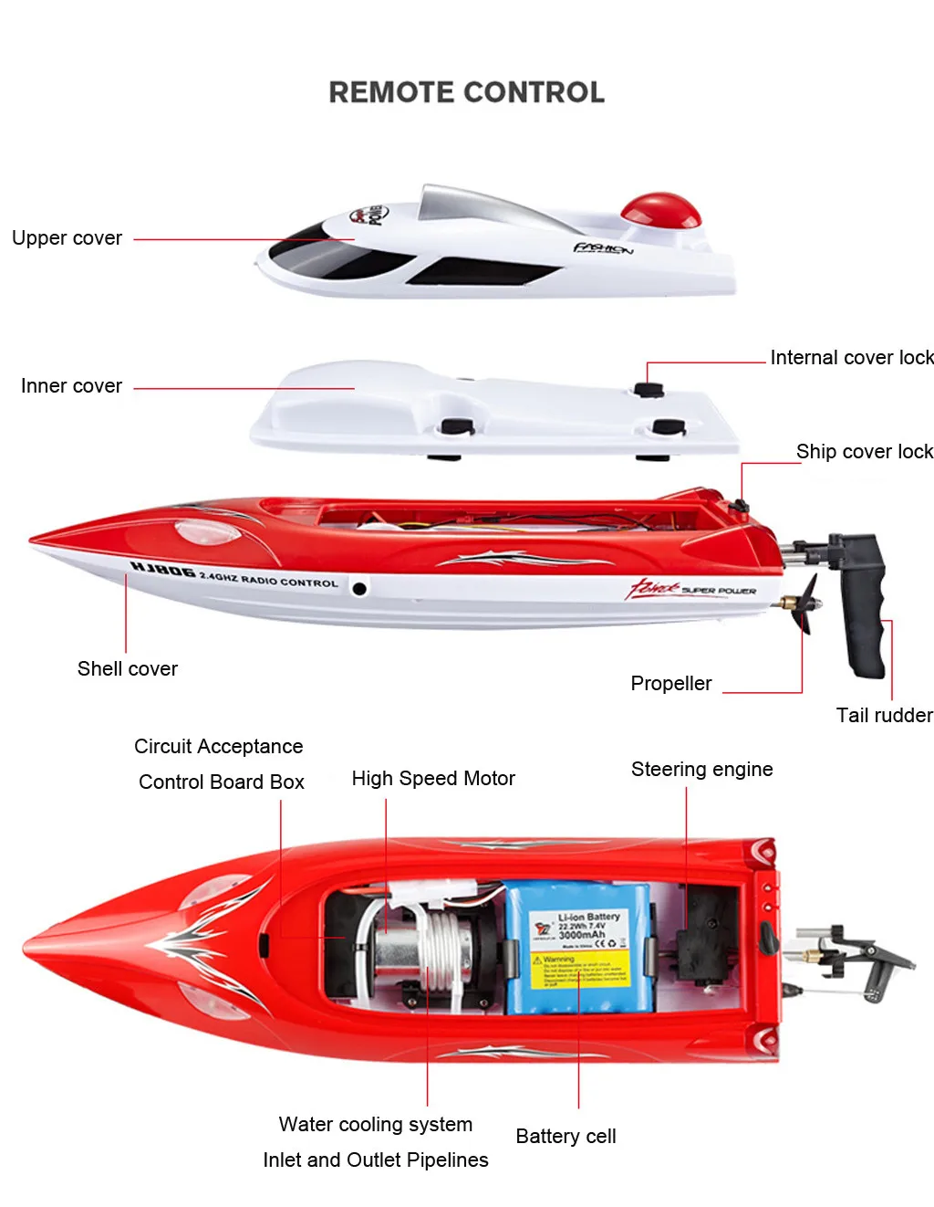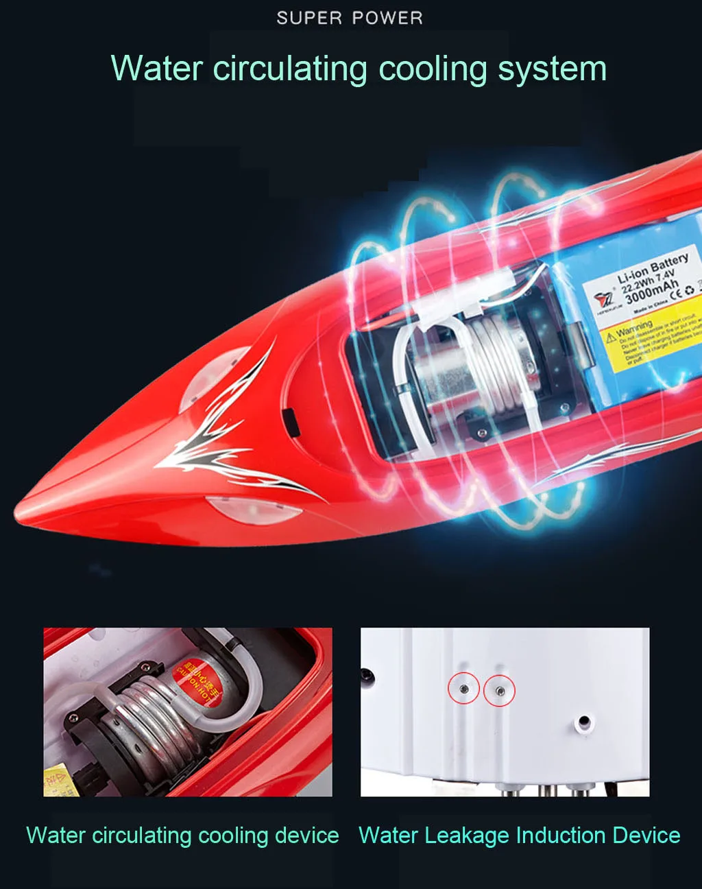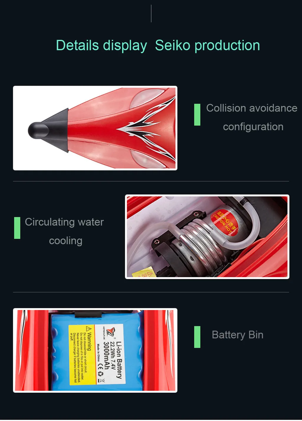 1. Со вспышкой ночной Светильник спереди и сзади. Вы можете включить или выключить его с помощью управления 2. Внутри лодки есть двухсторонний Низкий индикатор. И контроллер с индикатором заряда батареи 3. С ограниченным контролем во время вождения, вы можете настроить самую высокую скорость 4. С 540 двигателем. Сильная мощность. С оборудованием водяного охлаждения во время вождения 5. Есть функция защиты, когда лодки сломаны супер электричеством 6. Индикатор расстояния. Будет теплее, когда лодка будет контролироваться на расстоянии 7. Защитный чехол круглой формы 8. Функция автоматического переворачивания может привести магазины лодок снова, когда он переворачивается. 9. Конструкция лодочного хвоста радиолокационного типа 10. Водонепроницаемый двойной слой. Миниральной воды форма дизайн 11. Внутри лодки есть крышка для покрытия лодки. Выглядит более чистым и аккуратным снаружи 12. В 2,4 г частоты. Можно играть вместе с несколькими лодками