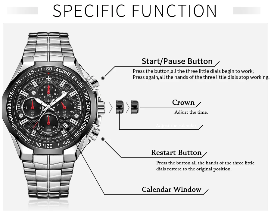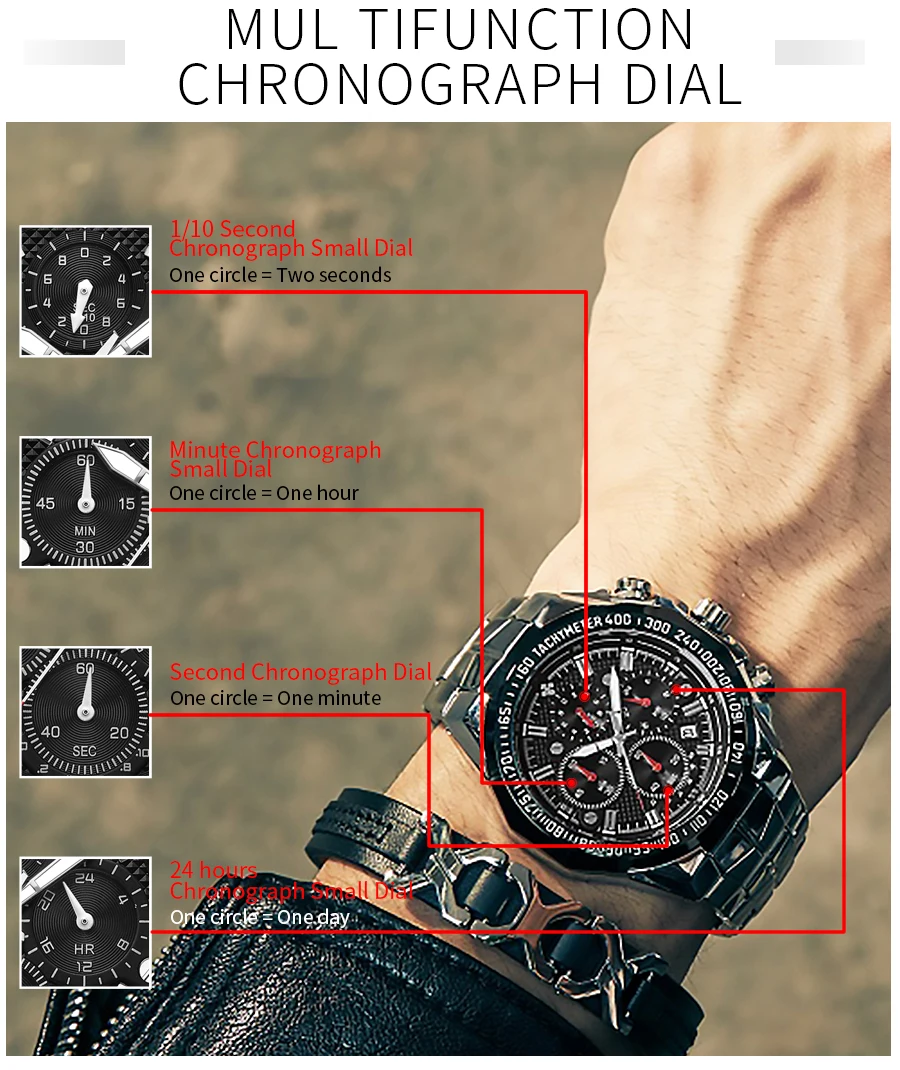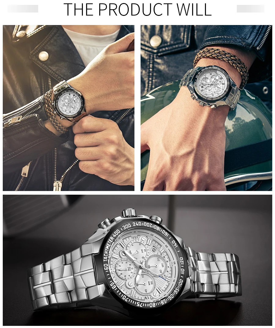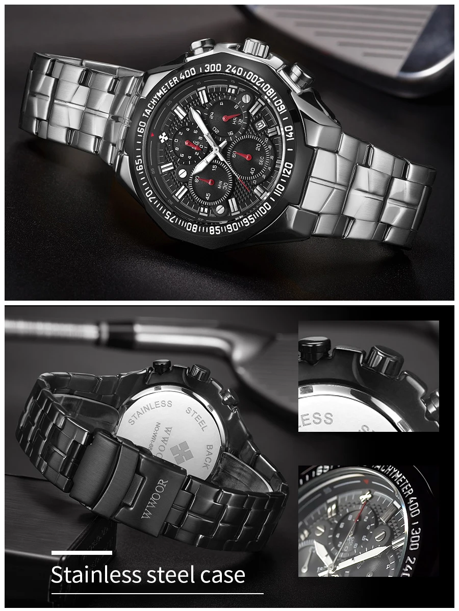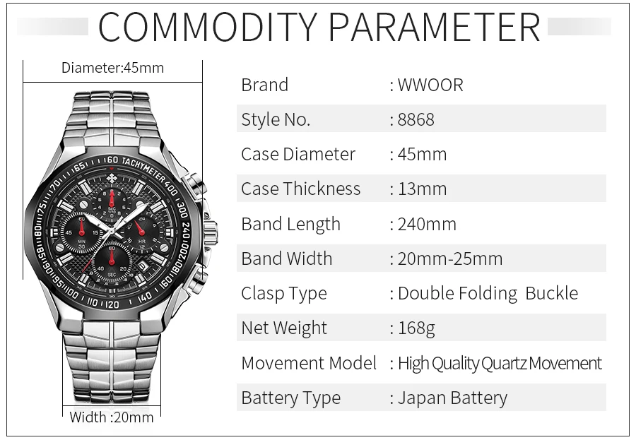 Уважаемые покупатели, мы поддерживаем прямые поставки и оптовую продажу по более низкой цене! Основная особенность: Материал корпуса: вакуумное покрытие из сплава Материал ремешка: нержавеющая сталь Механизм: кварцевый механизм высокого качества Функция: хронограф, секундомер, светящийся, водонепроницаемость 3 АТМ Многофункциональные часы. Все указатели рабочие. Эти часы имеют функцию хронографа. Параметры: -Диаметр корпуса: 45,0 мм -Толщина корпуса: 13,0 мм -Ширина полосы: 20-25 мм -Общая длина: 240 мм -Вес изделия: 168 г Посылка -1 часы WWOOR -1 подарочная коробка WWOOR