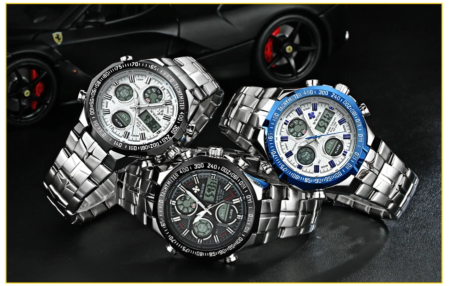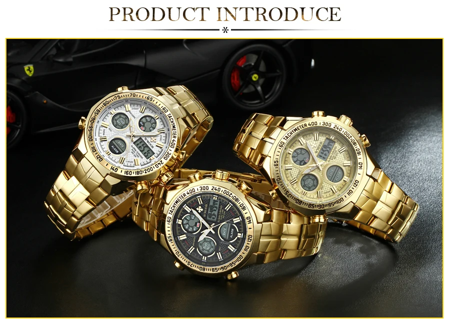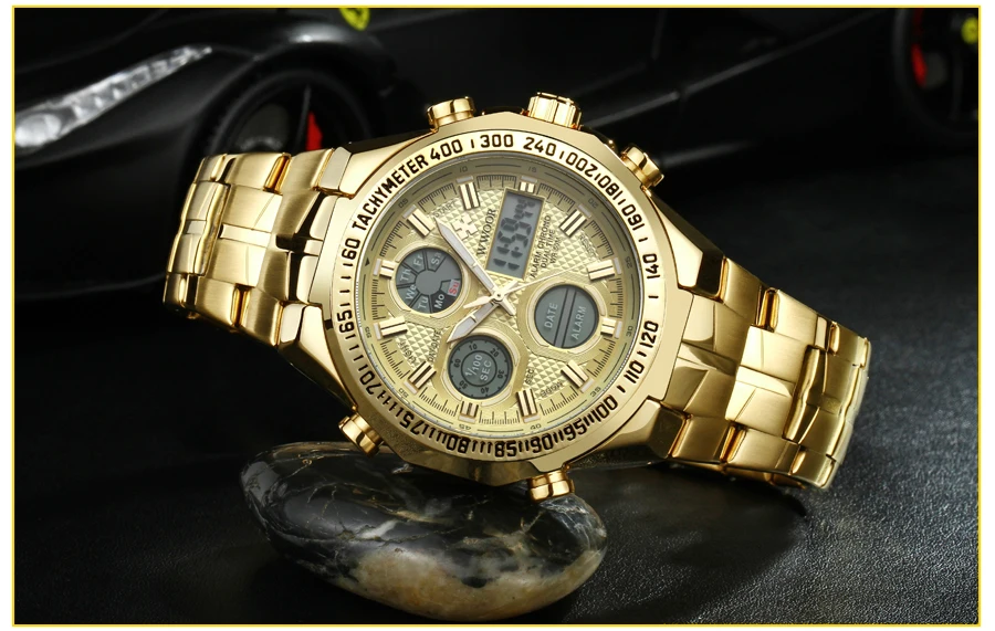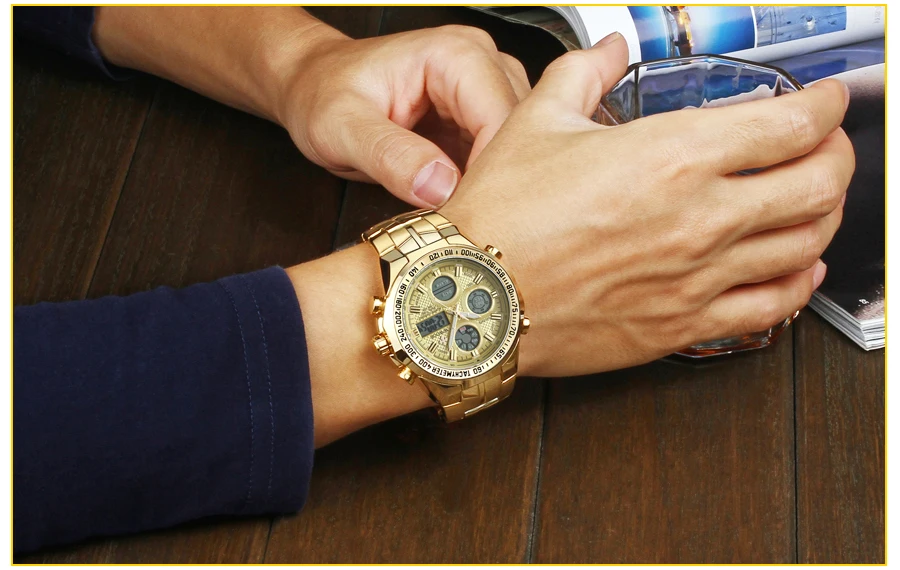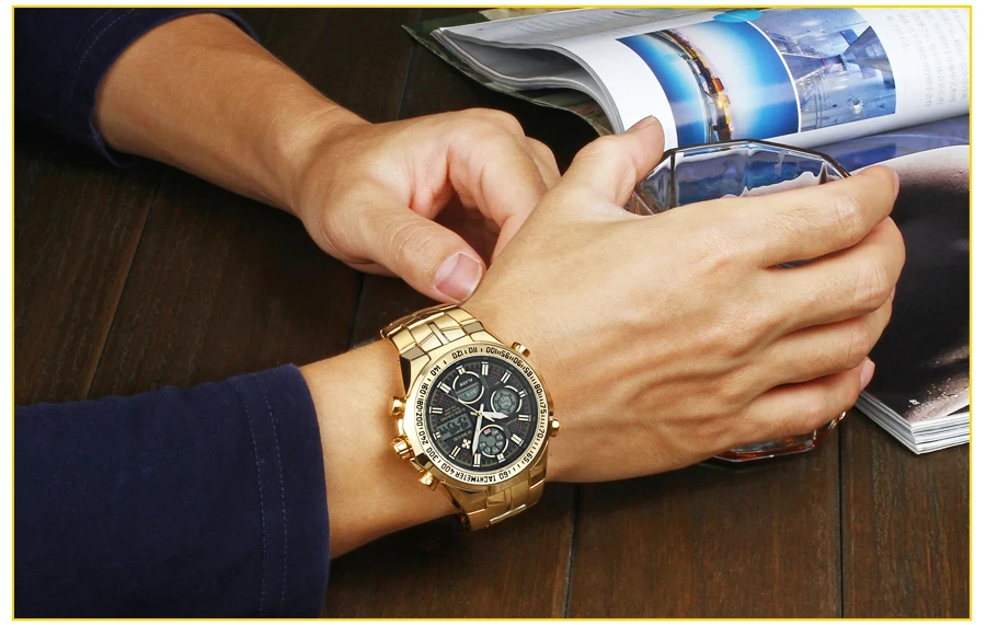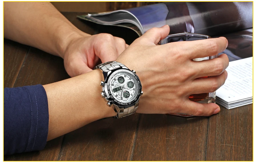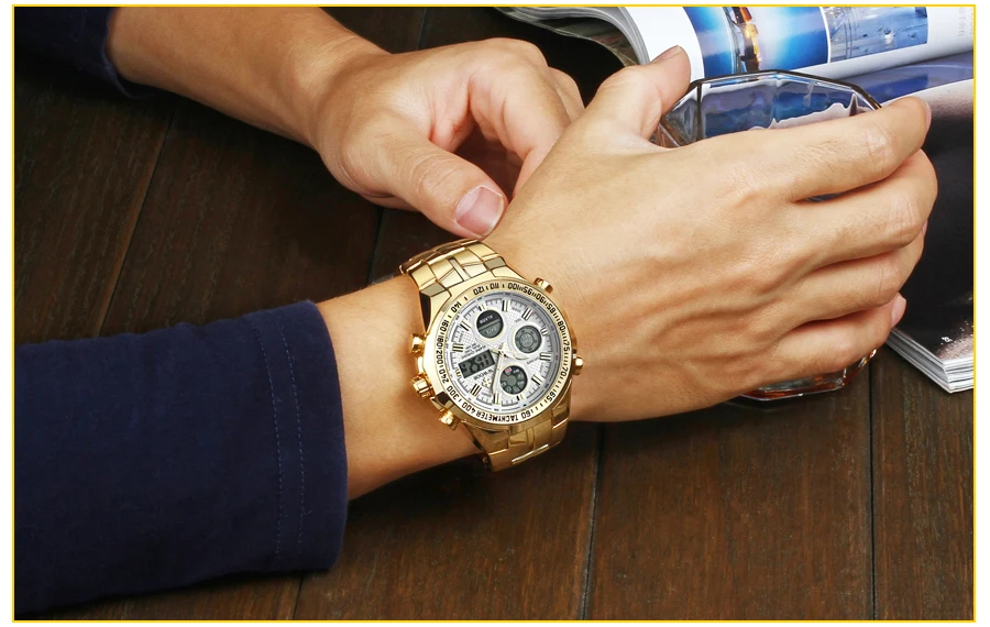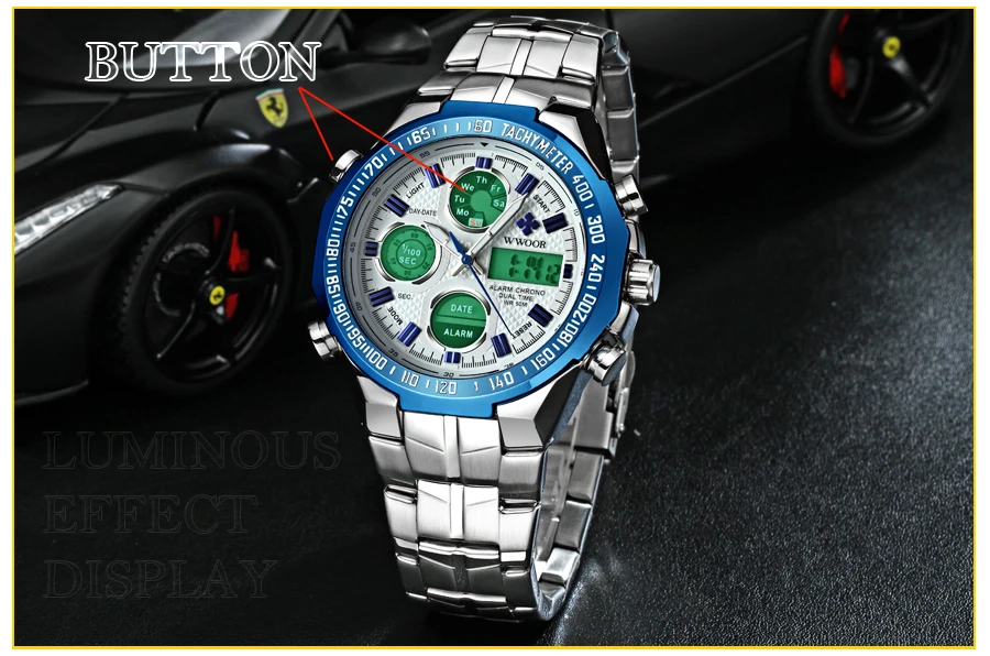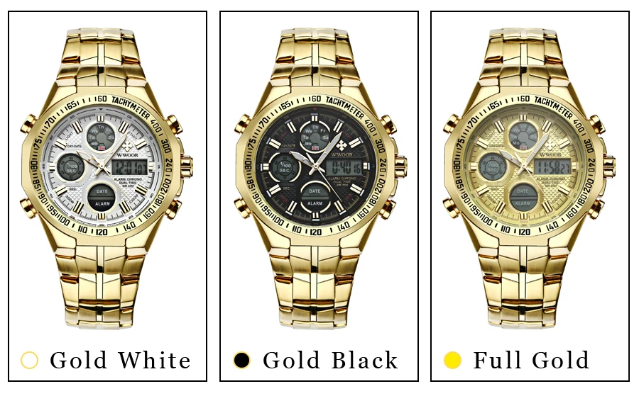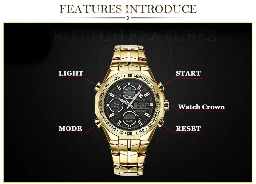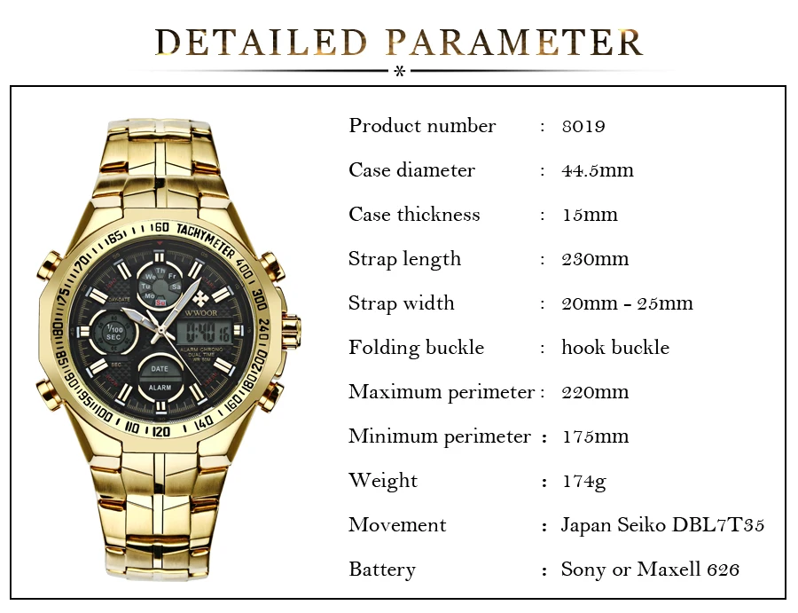 Уважаемые клиенты, мы поддерживаем прямую доставку и оптовую продажу, более низкую цену! Основные Особенности: 100% абсолютно новый, высококачественный двухъядерный, будильник, неделя повтора, отображение даты и времени, хронограф с 1/100 круговым управлением, функция подсветки аналогового и цифрового дисплея, функция ежечасного звонка, водонепроницаемость 50 метров (Не используйте часы под водой или прикоснитесь к горячей воде, Поддерживайте душ для плавания и холодной воды) Техническими показателями Чехол Материал: сплав Чехол диаметр: 44,5 мм Чехол Толщина: 15 мм Материал ремешка: нержавеющая сталь Длина ремешка: 230 мм (включая чехол) Полоса пропускания: 20-25 мм Вес нетто: 174 г Механизм: двойной дисплей Процесс: Гальваническое покрытие (не выцветает в течение двух лет) Что входит в комплект -Часы WWOOR-1 шт. -1 x Подарочная коробка WWOOR