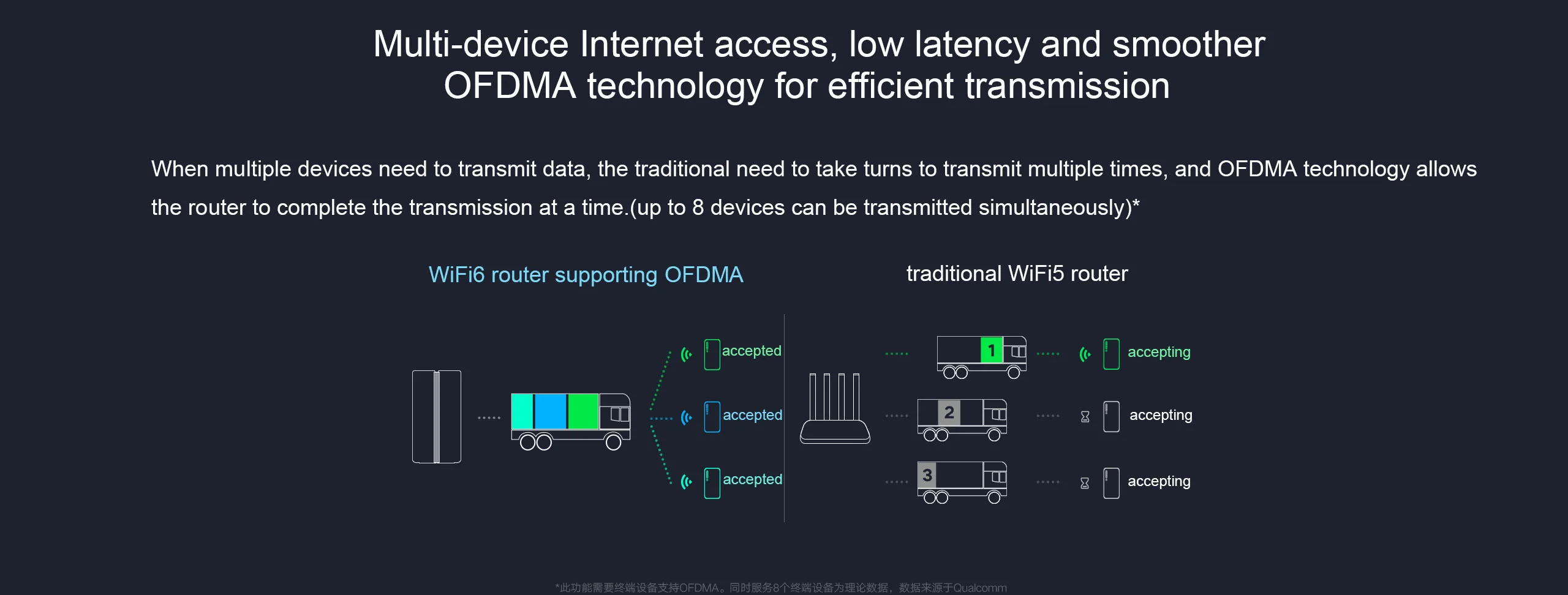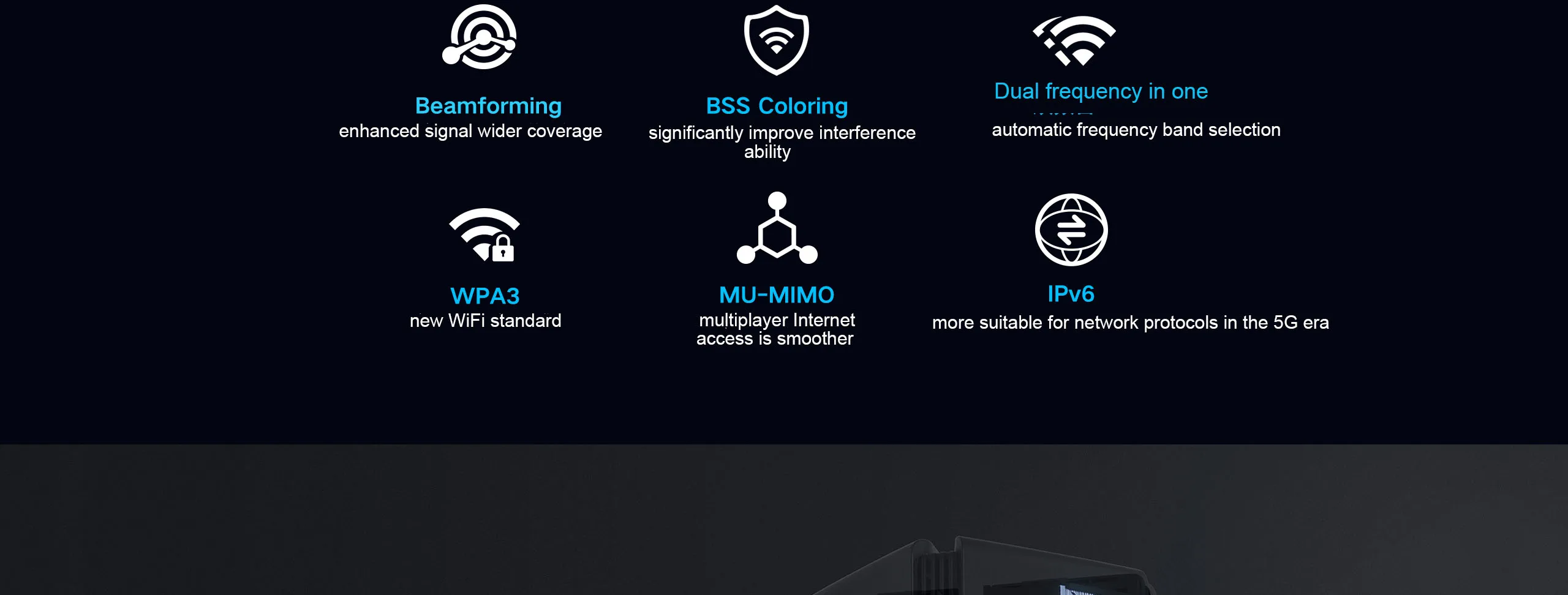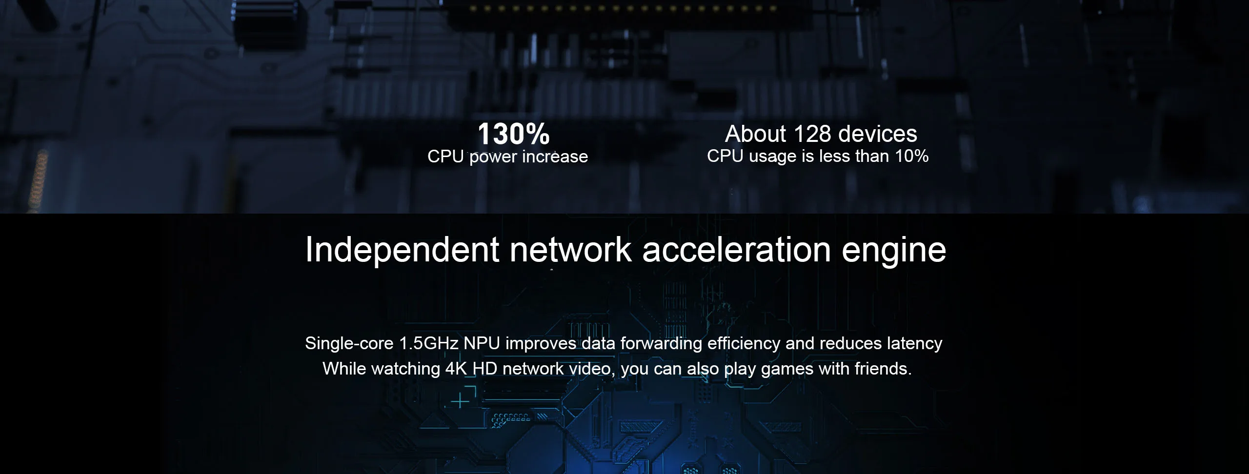 Процессор: IPQ6000 4-ядерный процессор A53 1,2 ГГц Двигатель сетевого ускорения: одноядерный 1,5 ГГц NPU ROM : 128 Мб Память: 256 Мб 2,4 ГГц WiFi : 2x2 (максимальная поддержка протокола IEEE 802.11ax, теоретическая максимальная скорость до 574 Мбит/с) 5 ГГц WiFi : 2x2 (максимальная поддержка протокола IEEE 802.11ax, теоретическая максимальная скорость может достигать 1201 Мбит/с) Антенна продукта: 2 встроенных двухчастотных антенны Охлаждение продукта: Естественное охлаждение